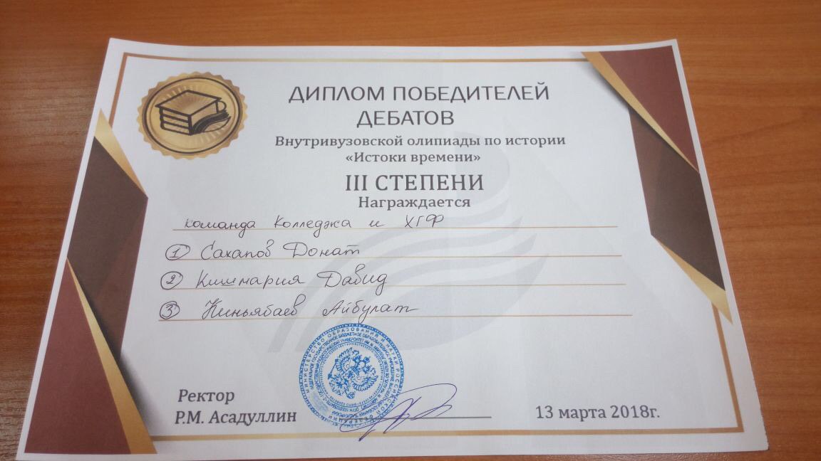 Студенты специальности «Право и организация социального обеспечения» Кишмария Давид (9ПСО-21), Сахапов Донат (9ПСО-32), были награждены дипломом победителей дебатов III степени.
