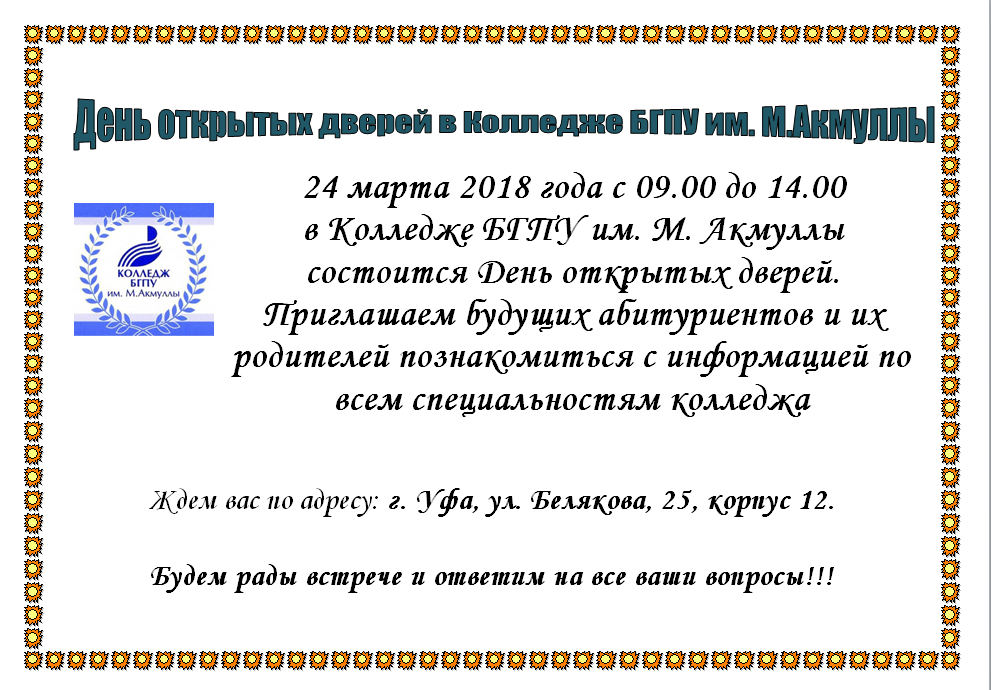 24 марта 2018 года с 09.00 до 14.00 в Колледже БГПУ им. М. Акмуллы состоится День открытых дверей.
