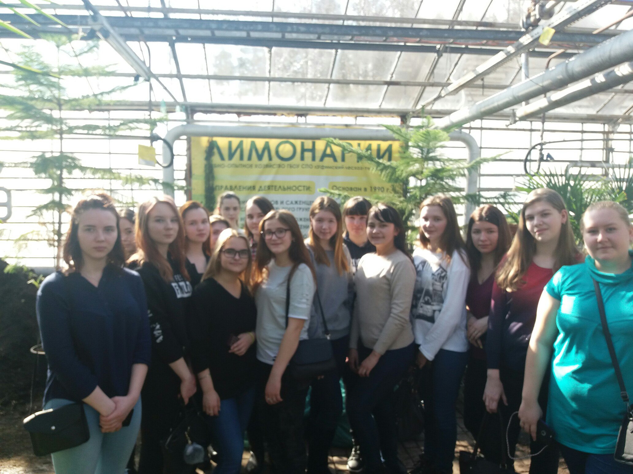 В рамках декадника по экологии были проведены экскурсии в лимонарий (Учебно-опытное хозяйство ГБПОУ «Уфимский лесотехнический техникум»). Группы 9ИЗО-11, 9ДО-11, 9Б-11 под руководством преподавателя Плехановой О.Т. посетили экскурсию. Попав из зимы в лето, студенты насладились прекрасным ароматом лимонов и других растений. Учащиеся узнали много нового о бананах, лимонах, кофейном дереве. Внимательно слушали экскурсовода и задавали много интересующих вопросов. Ребята остались довольны экскурсией.