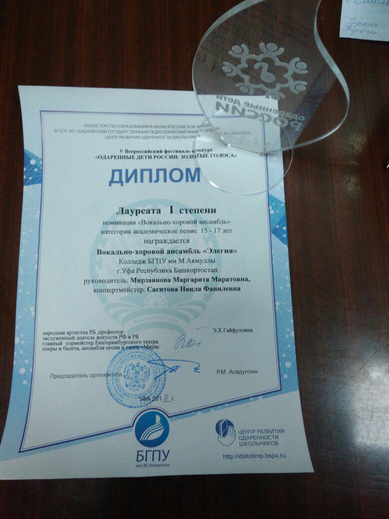 24 марта хор группы 9МО-21 под управлением Мирзаяновой Маргариты Маратовны, и хор группы 9МО-41 под управлением Смаевой Ларисы Вакиловны ( концертмейстер Сагитова Н.Ф.) получили высокое звание Лауреатов 1 степени во Всероссийском конкурсе "Одаренные дети". Конкурс проводился в БГПУ им.М.Акмуллы,в концертном зале Училища искусств.