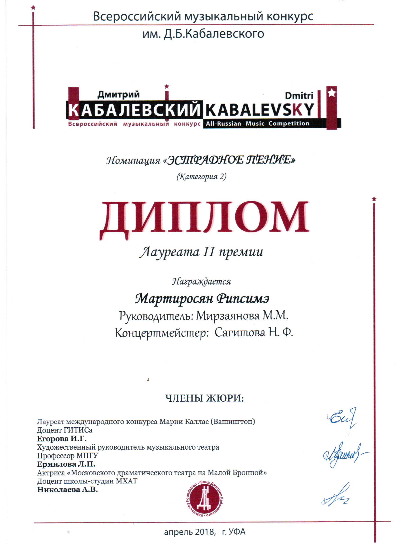 Мартиросян Рипсимэ - Лауреат II степени во Всероссийском музыкальном конкурсе