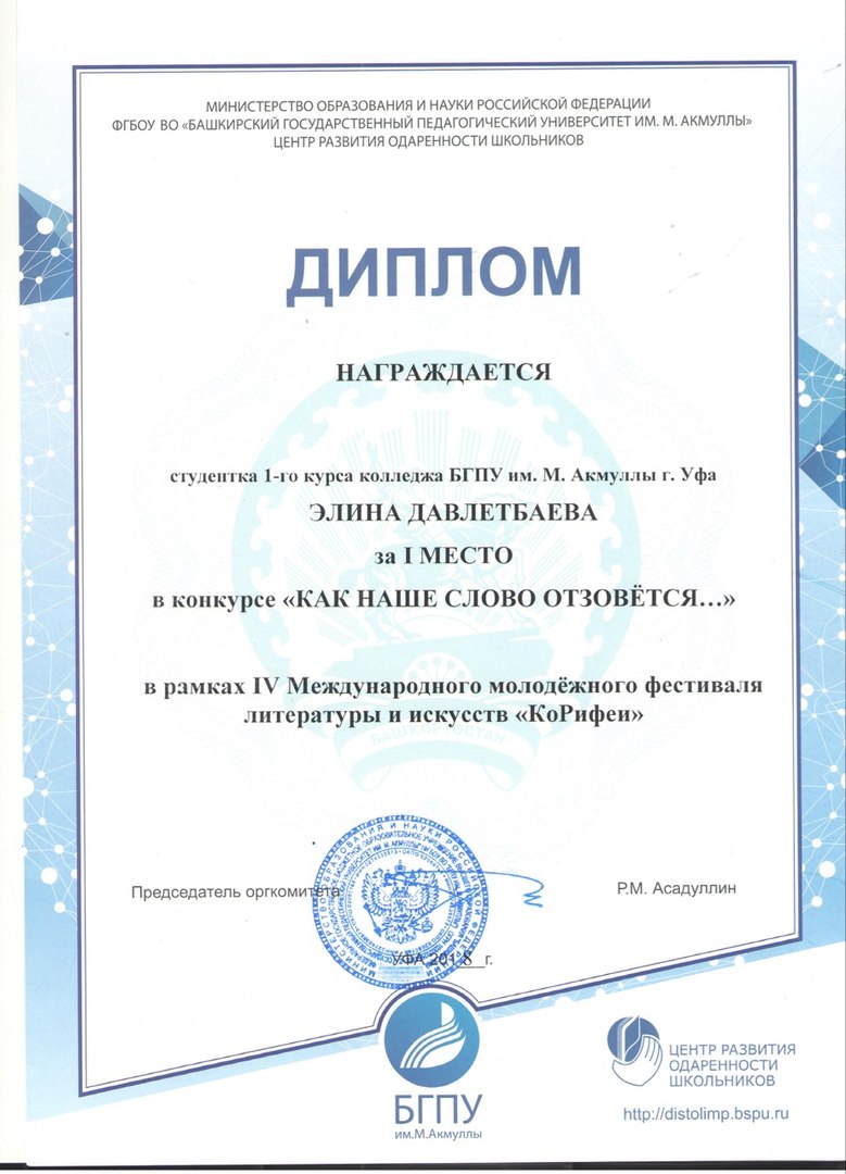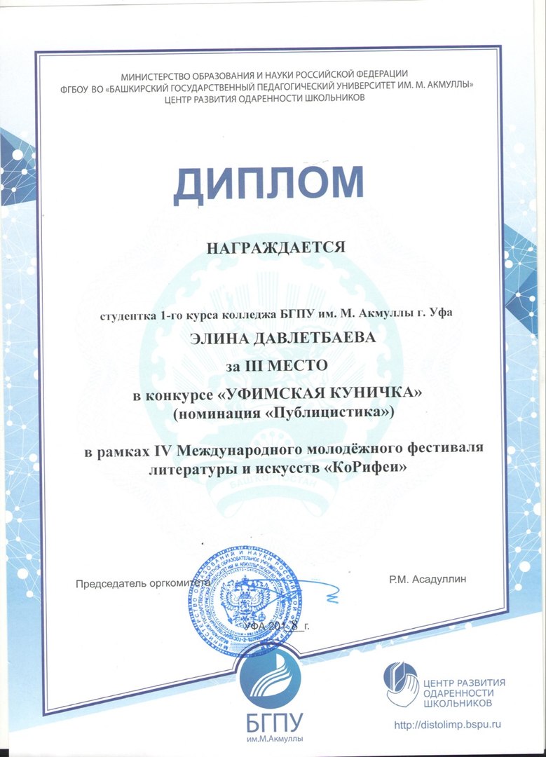 Студентка нашего учебного заведения Давлетбаева Элина приняла участие в этом фестивале. И была награждена дипломами: 1 место в конкурсе "Как наше слово отзовется...", 2 место в конкурсе "Уфимская куничка" (номинация "Проза"), 3 место в конкурсе "Уфимская куничка" (номинация "Публицистика").
