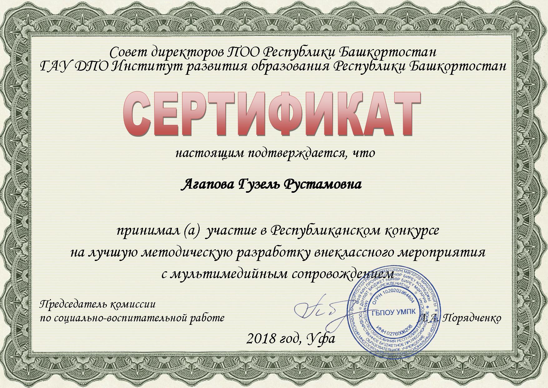 ГАУ ДПО Институт развития образования Республики Башкортостан провел Республиканский конкурс на лучшую методическую разработку внеклассного мероприятия с мультимедийным сопровождением. Преподаватели нашего учебного заведения Бускунова А.А. и Агапова Г.Р. приняли участие в этом состязании и были награждены сертификатами участников. На конкурс были отправлены сценарии внеклассных мероприятий "Мухаметша Бурангулов- народный сэсэн Башкортостана" и "Страницы великой эпопеи. Памяти павших. (ко Дню Победы)" .