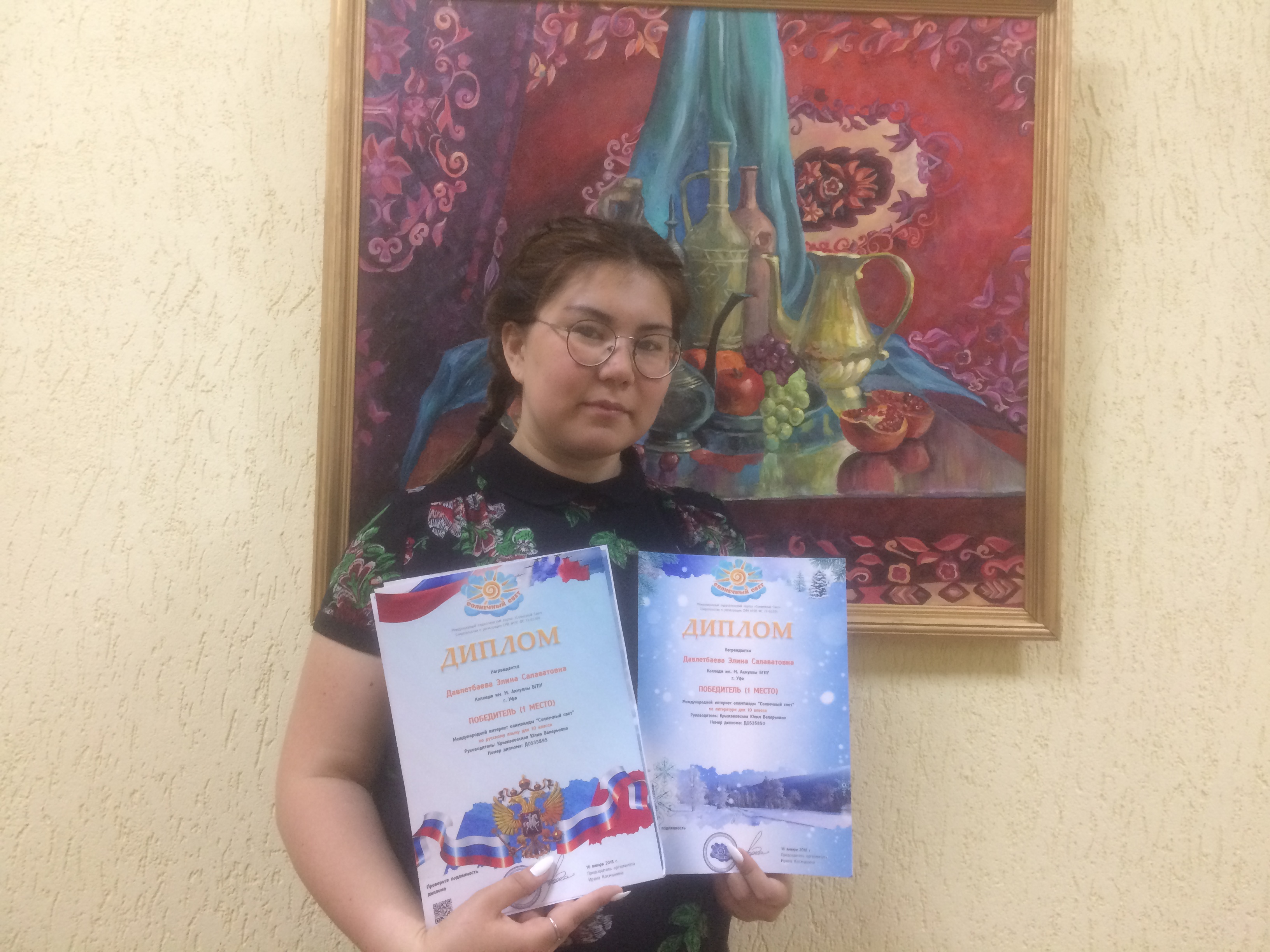 16 января в Международной интернет-олимпиаде «Солнечный свет» по русскому языку и литературе для 10 классов Элина заняла 1 место.