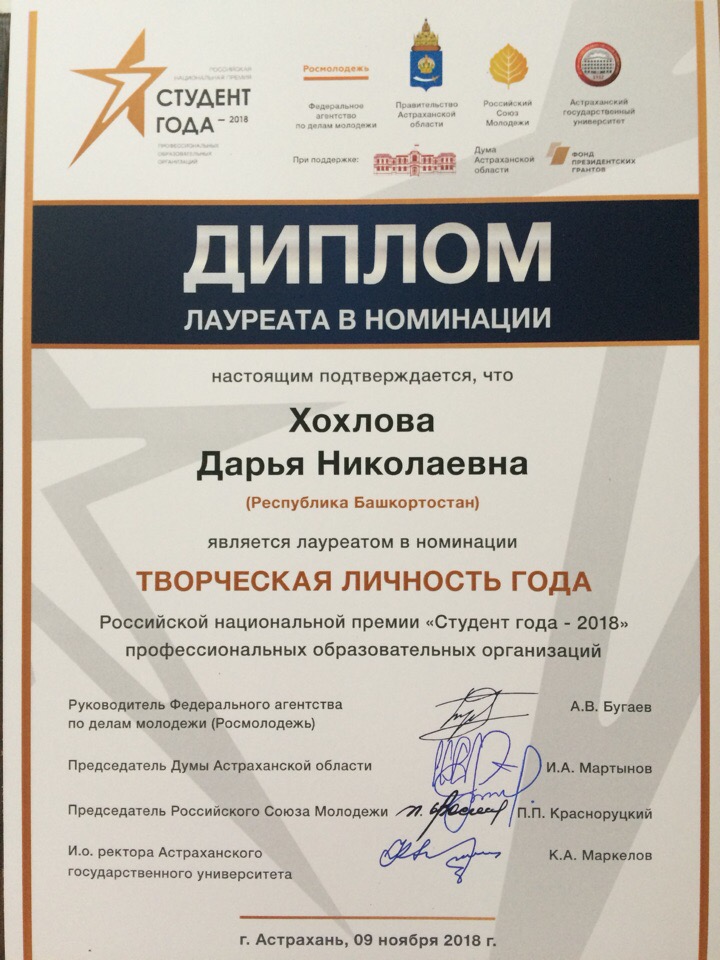 9 ноября в Астраханском государственном театре оперы и балета прошла торжественная церемония закрытия Российской национальной премии «Студент года - 2018» профессиональных образовательных организаций. Лауреатом национальной премии в номинации «Творческая личность года» стала студентка  пятого курса специальности "Музыкальное образование" Колледжа БГПУ им. М. Акмуллы Хохлова Дарья.