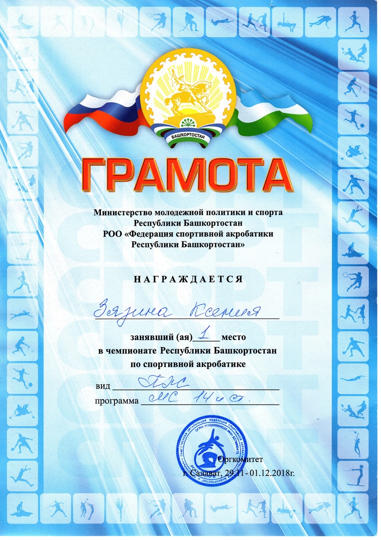 С 30 ноября по 2 декабря в г.Салават прошли Чемпионат и первенство Республики Башкортостан по спортивной акробатике. В соревнованиях приняли участие ведущие акробаты из Башкортостана - всего более 240 спортсменов. Студентка второго курса Колледжа БГПУ им.М.Акмуллы специальности «Физическая культура» Ксения Зиязина стала победительницей в составе женской пары среди мастеров спорта 13-19 лет.  Впереди у сборной команды Республики Башкортостан ответственные соревнования - чемпионат и первенство ПФО в Кирове с 8 по 12 января 2019 года.