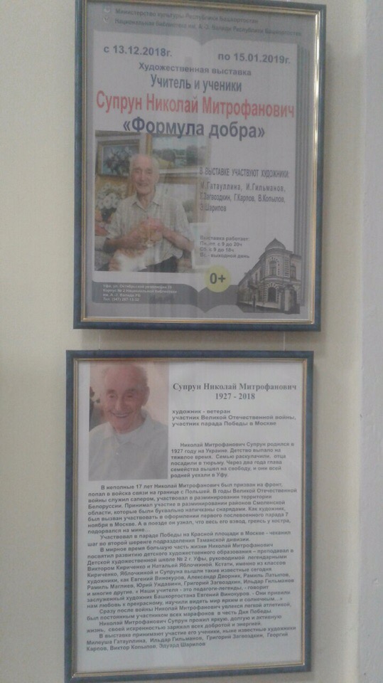 В Доме купца Чижова (ул. Октябрьской революции, 10, Национальная библиотека имени Заки Валиди) завершила работу выставка «Учитель и ученики. Супрун Николай Митрофанович (1927-2018гг.), «Формула добра». Выставка посвящена памяти видного уфимского живописца. Большую часть жизни Николай Митрофанович посвятил развитию детского художественного образования – преподавал в Детской художественной школе № 2 г. Уфы. В выставке приняли участие ученики Николая Супруна – ныне известные художники Милеуша Гатауллина, Ильдар Гильманов, Григорий Загвоздкин, Георгий Карпов, Виктор Копылов, Эдуард Шарипов. Студентам четвертого курса специальности «Изобразительное искусство и черчение» Колледжа БГПУ им. М. Акмуллы посчастливилось посетить данную выставку и получить заряд творческой энергии.