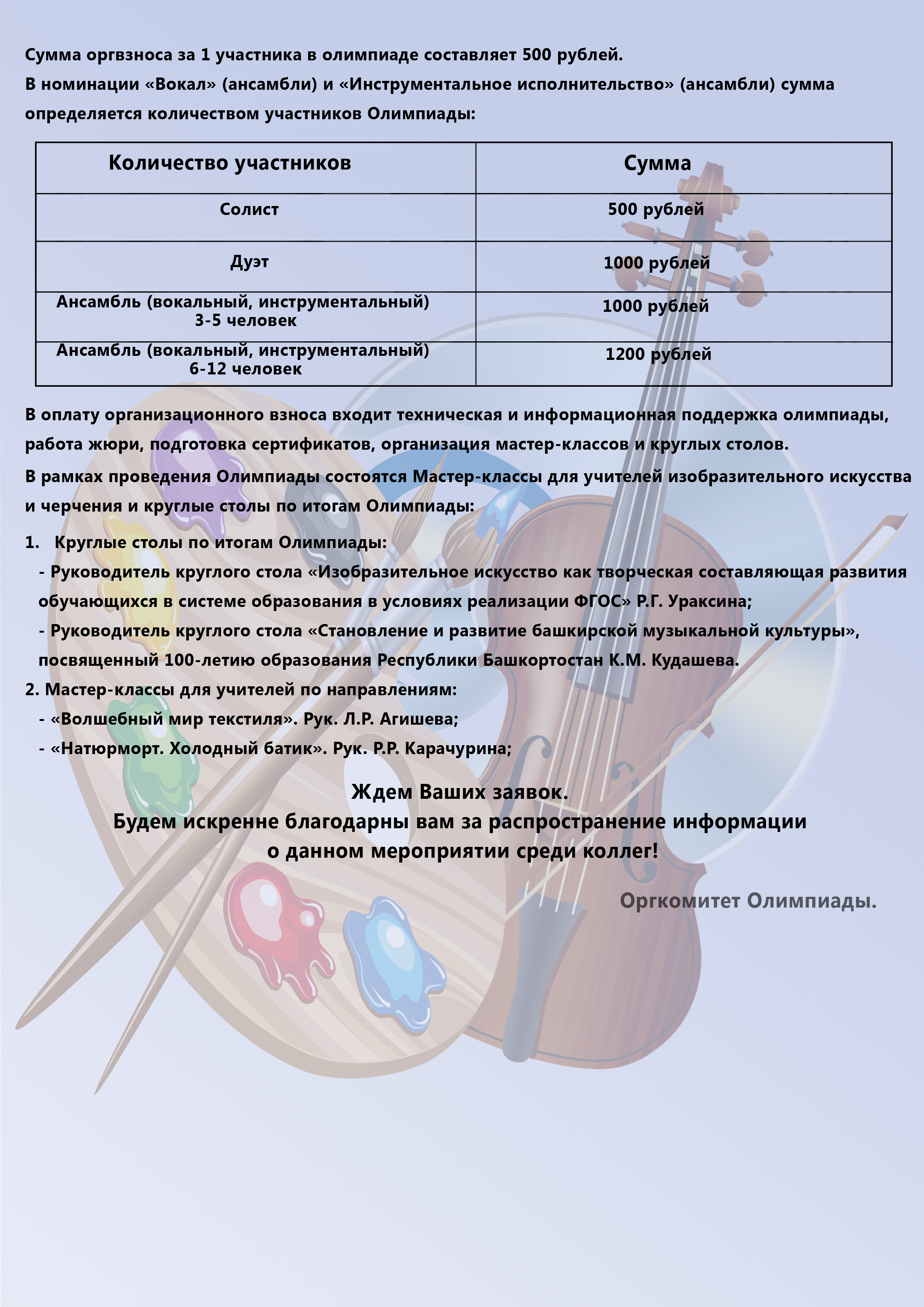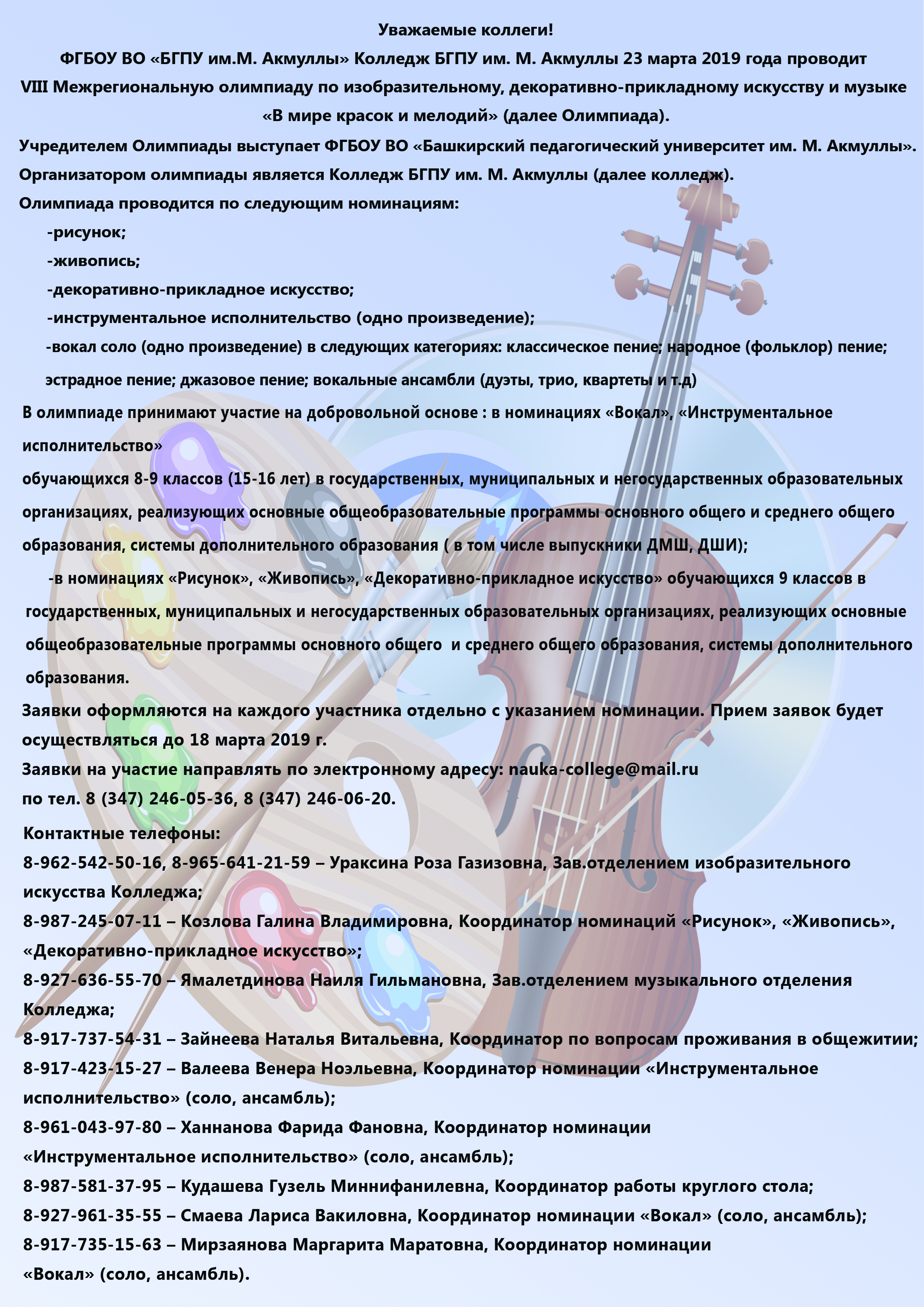 23 марта 2019 года Колледж БГПУ им.М.Акмуллы традиционно проводит межрегиональную олимпиаду по изобразительному, декоративно-прикладному искусству и музыке "В мире красок и мелодий". Уважаемые коллеги, ждем Ваших заявок!