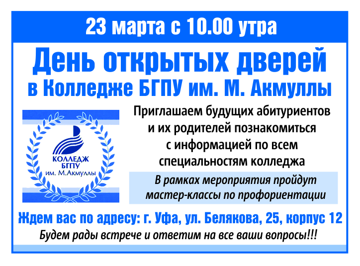 23 марта 2019 года в Колледже БГПУ им.М.Акмуллы состоится день открытых дверей. Приглашаем абитуриентов по адресу ул.Белякова, 25.