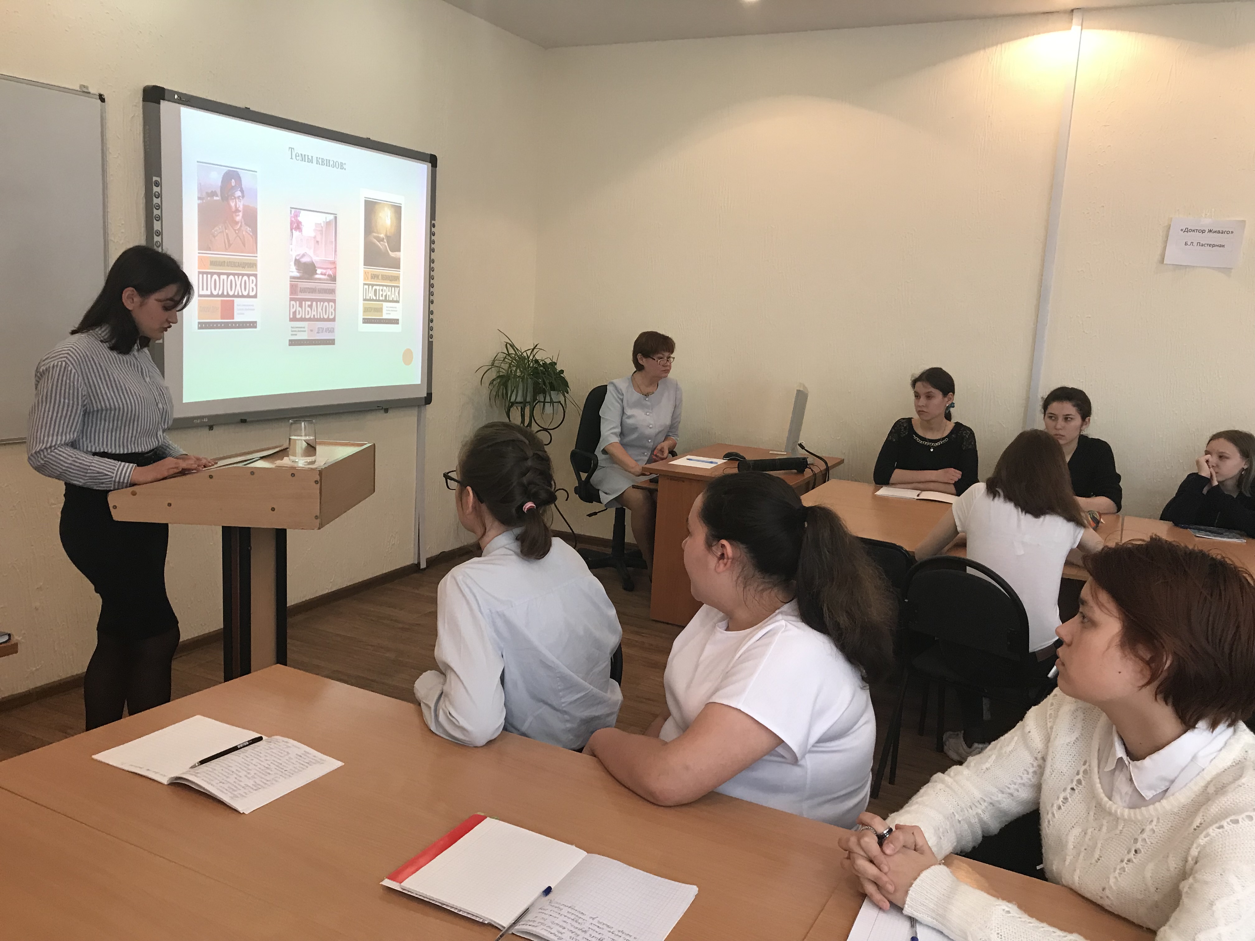 В рамках декадника на специальности «Библиотековедение»  проведен открытый комбинированный урок – библио-квиз  «Литература XX века – «трагические судьбы».  Участники, студенты второго  курса,  продемонстрировали знания в области  биографии писателей,  проиллюстрировали неизвестные и интересные факты из их жизни, осветили  вопросы  актуальности произведений, проблематику. Выпускники третьего курса специальности подготовили и провели библио-квиз (командная интеллектуальная и творческая игра с использованием мультимедийного оборудования) по произведениям Шолохова М.А «Тихий Дон», Рыбакова А.Н. «Дети Арбата», Пастернака Б.Л  «Доктор Живаго».За верные ответы команд жюри засчитывали баллы. Студенты  проявили интерес к данной форме проведения занятия. В завершение комбинированного урока все участники представили тезисы с обоснованием  актуальности данных произведений. Занятие прошло на хорошем уровне, участники справились с заданиями и продемонстрировали свои профессиональные качества.