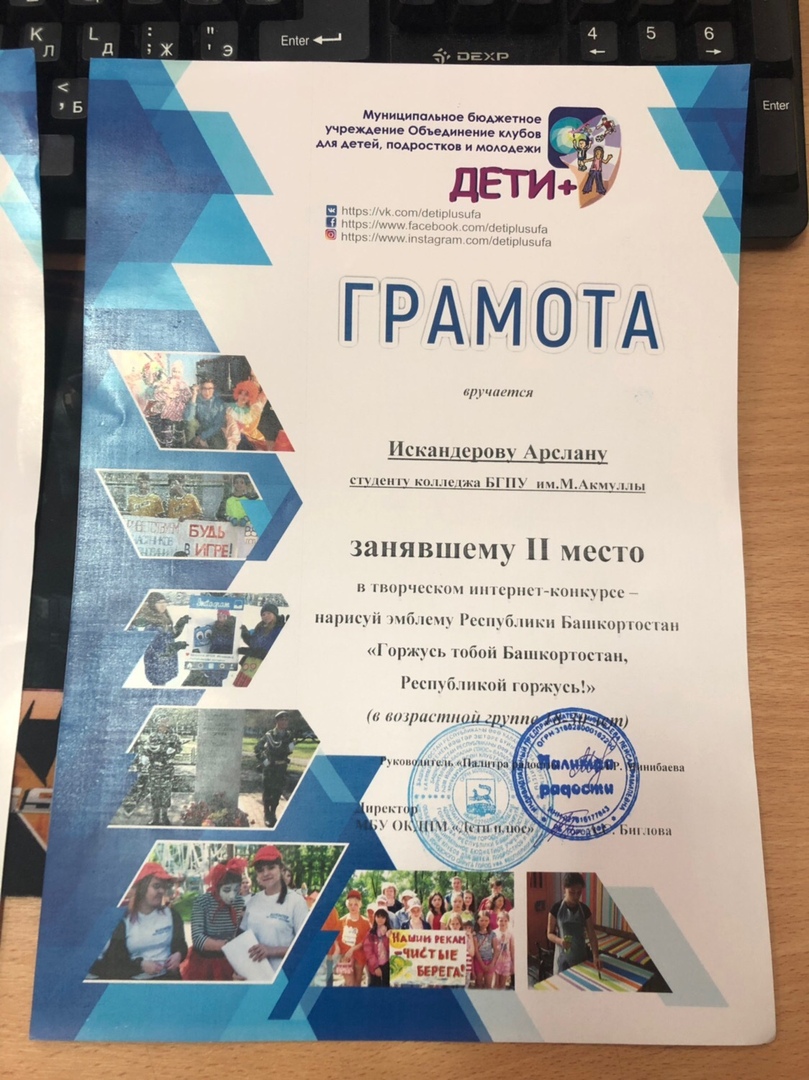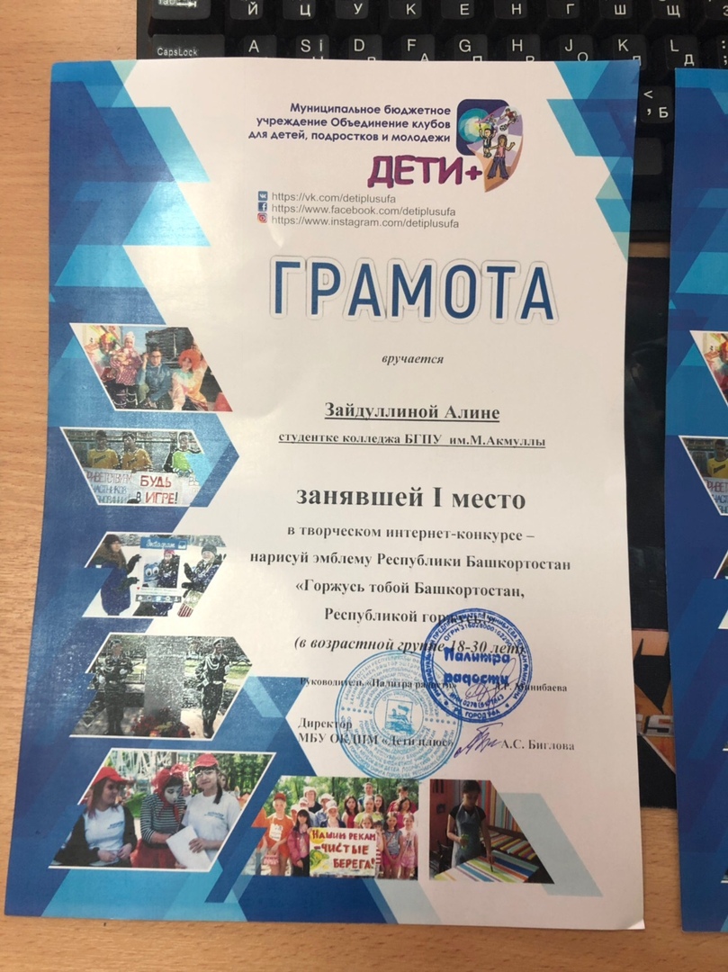 10 апреля в Уфимском многопрофильном профессиональном колледже состоялось награждение победителей творческого интернет-конкурса на лучшую  эмблему Республики Башкортостан «Горжусь тобой Башкортостан, Республикой горжусь!» по итогам конкурса Призовые первое и второе места заняли студенты третьего курса специальности «Изобразительное искусство и черчение» Зайдуллина Алина и Искандеров Арслан. Поздравляеми желаем дальнейших творческих успехов!