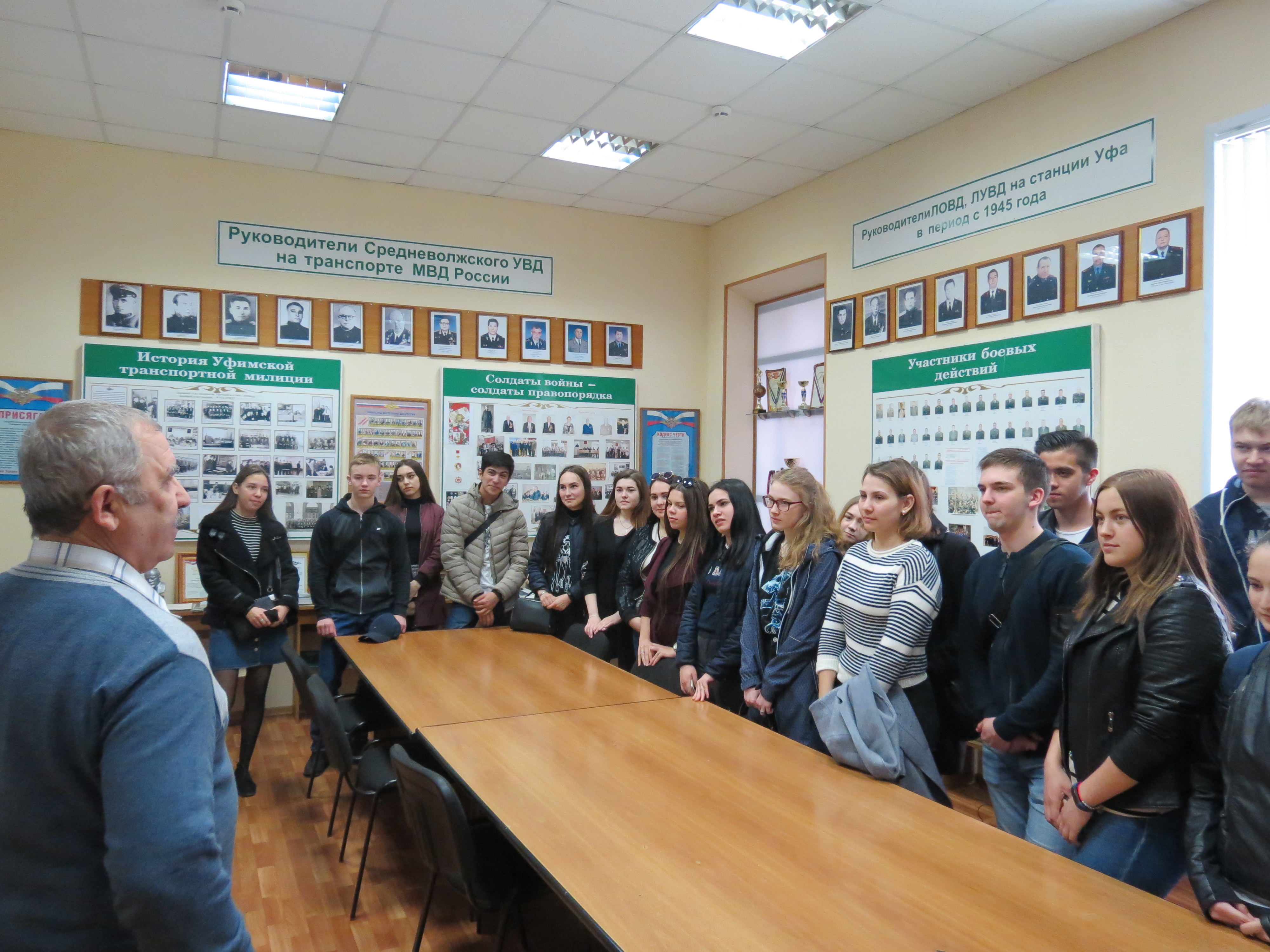 Председатель Общественного совета Уфимского ЛУ МВД России на транспорте рассказал об истории появлении транспортной полиции в стране и в нашем регионе. Студенты окунулись в историю благодаря экскурсии по музею линейного управления, своими глазами увидев милицейскую форму прошлого века и технику, которую использовали еще в годы Советского союза.