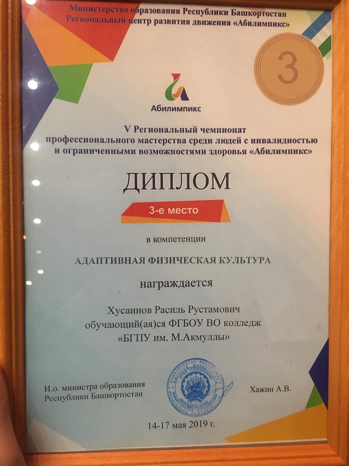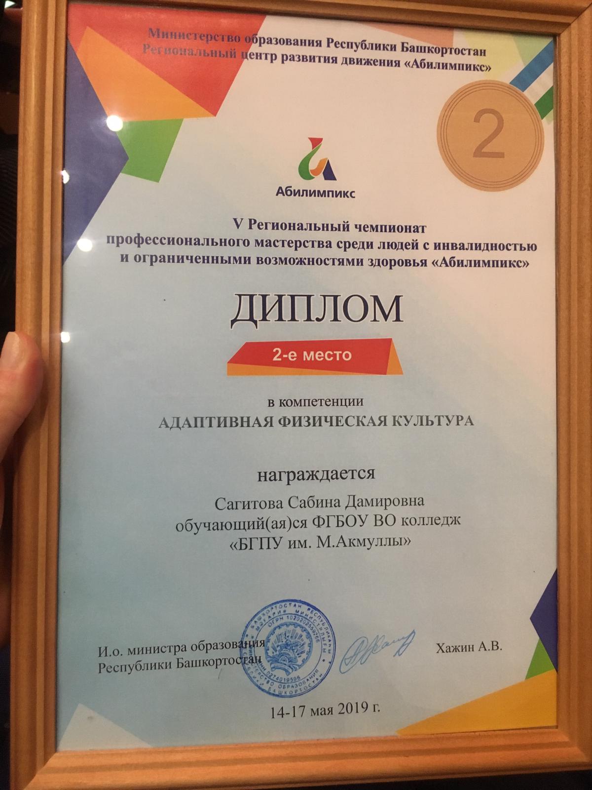 В Республике Башкортостан c 14 по 17 мая 2019 года состоялся V Региональный отборочный этап Национального чемпионата профессионального мастерства “Абилимпикс” среди людей с инвалидностью и ограниченными возможностями здоровья. Участники конкурса показали своё мастерство на площадках 8 профессиональных образовательных организаций городов Уфа, Стерлитамак, Салават. Студенты Колледжа приняли участие в конкурсе по компетенциям «Адаптивная физическая культура», «Туризм», «Обработка текста».По компетенциям «Адаптивная физическая культура» второе  место заняла студентка второго курса специальности «Физическая культура» Сагитова Сабина, третье место - Хусаинов Расиль студент третьего курса. По компетенциям «Туризм»  второе место заняла студентка второго курса специальности «Туризм» Полякова Валерия.