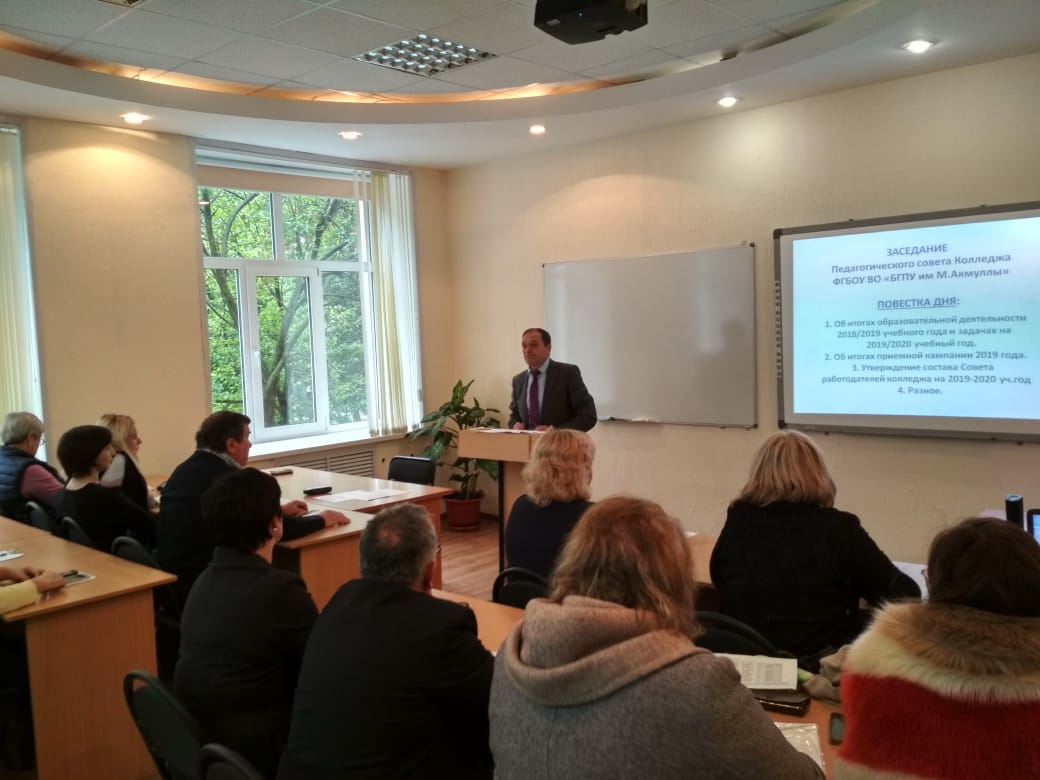 В колледже БГПУ состоялось заседание Педагогического совета. С итогами 2018-2019 учебного года и определением задач на 2019-2020 гг. выступили с докладом заместитель директора по учебно-методической работе А.А.Юферова и заместитель директора по учебно-воспитальной работе Н.Н.Гардамшина. Старший методист Н.Г. Будрина подвела итоги методической работы и познакомила с планом работы по подготовке к государственной аккредитации. Анализ работы приемной кампании подвела в своем выступлении заместитель ответственного секретаря приемной комиссии А.Р. Мукадасова. На педагогическом  совете был рассмотрен и утвержден список состава работодателей специальностей колледжа, с этим вопросом выступила заведующая практикой Н.Г.Ананьева.