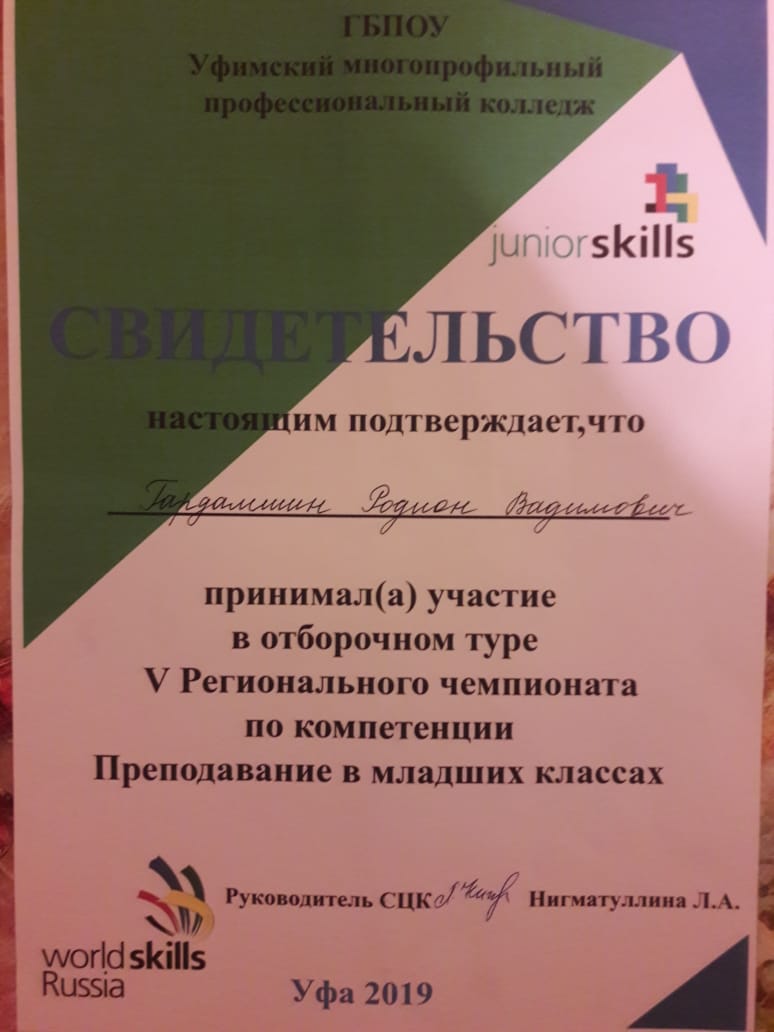 17 октября на базе Уфимского многопрофильного профессионального колледжа прошел Отборочный тур Регионального этапа чемпионата WorldSkills - 2019 среди юниоров (14-15 лет). Преподаватель Колледжа БГПУ им.М.Акмуллы Низамова Р.Р. выступила в качестве компатриота обучающегося МБОУ Школа 104 им.М.Акмуллы- Гардамшина Родиона. Они представили компетенцию "Преподавание в начальных классах". В течение трех часов конкурсанты- обучающиеся школ и колледжей республики должны были составить воспитательное занятие с применением интерактивной доски и элементов робототехники.  Составленное занятие конкурсанты проводили с предоставленными волонтёрами в течении 15 минут. Все  конкурсанты получили  опыт участия в чемпионатах подобного уровня. А преподаватели-компатриоты - преподаватели отработали навык участия в экспертной оценке чемпионатов WorldSkills.