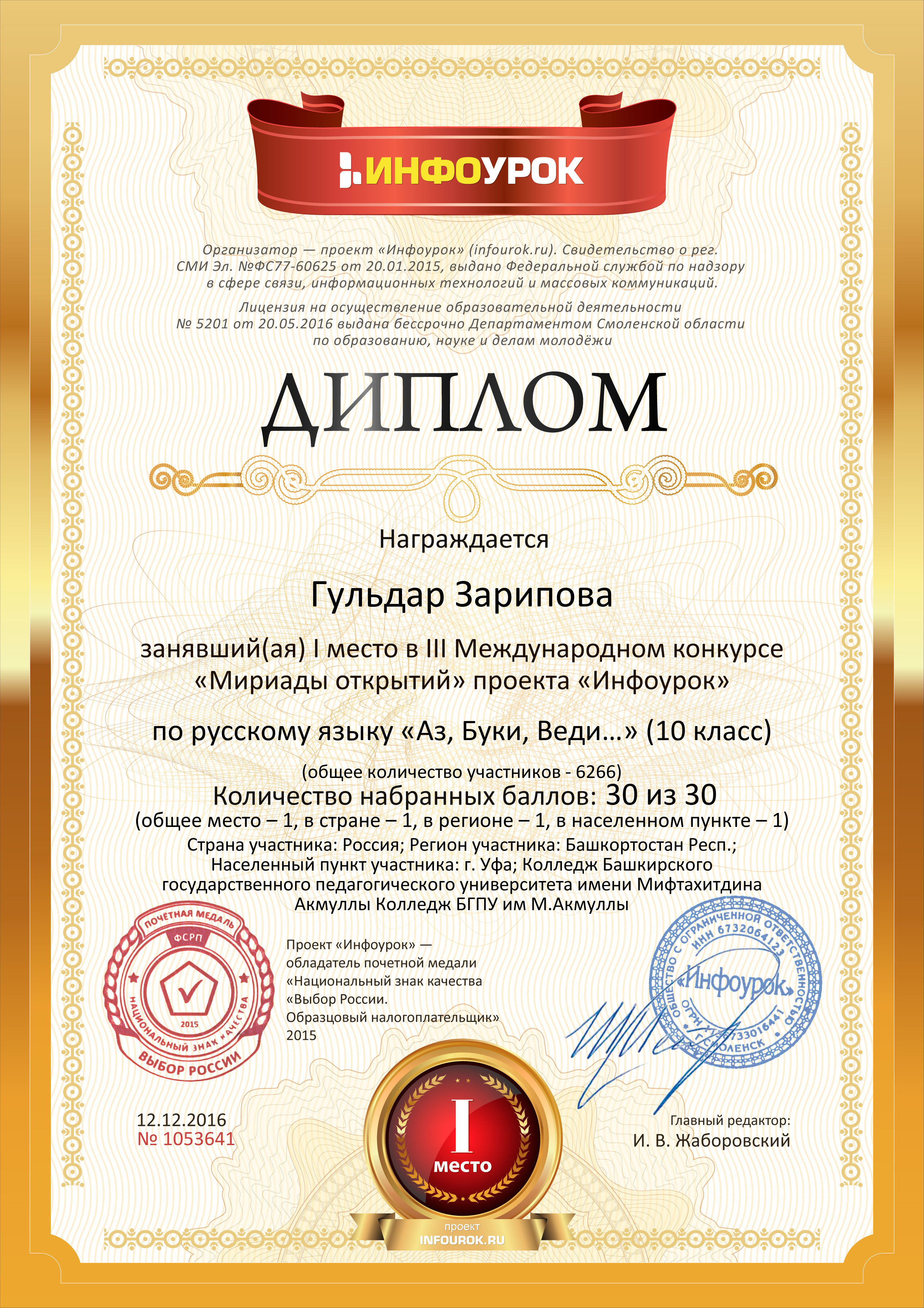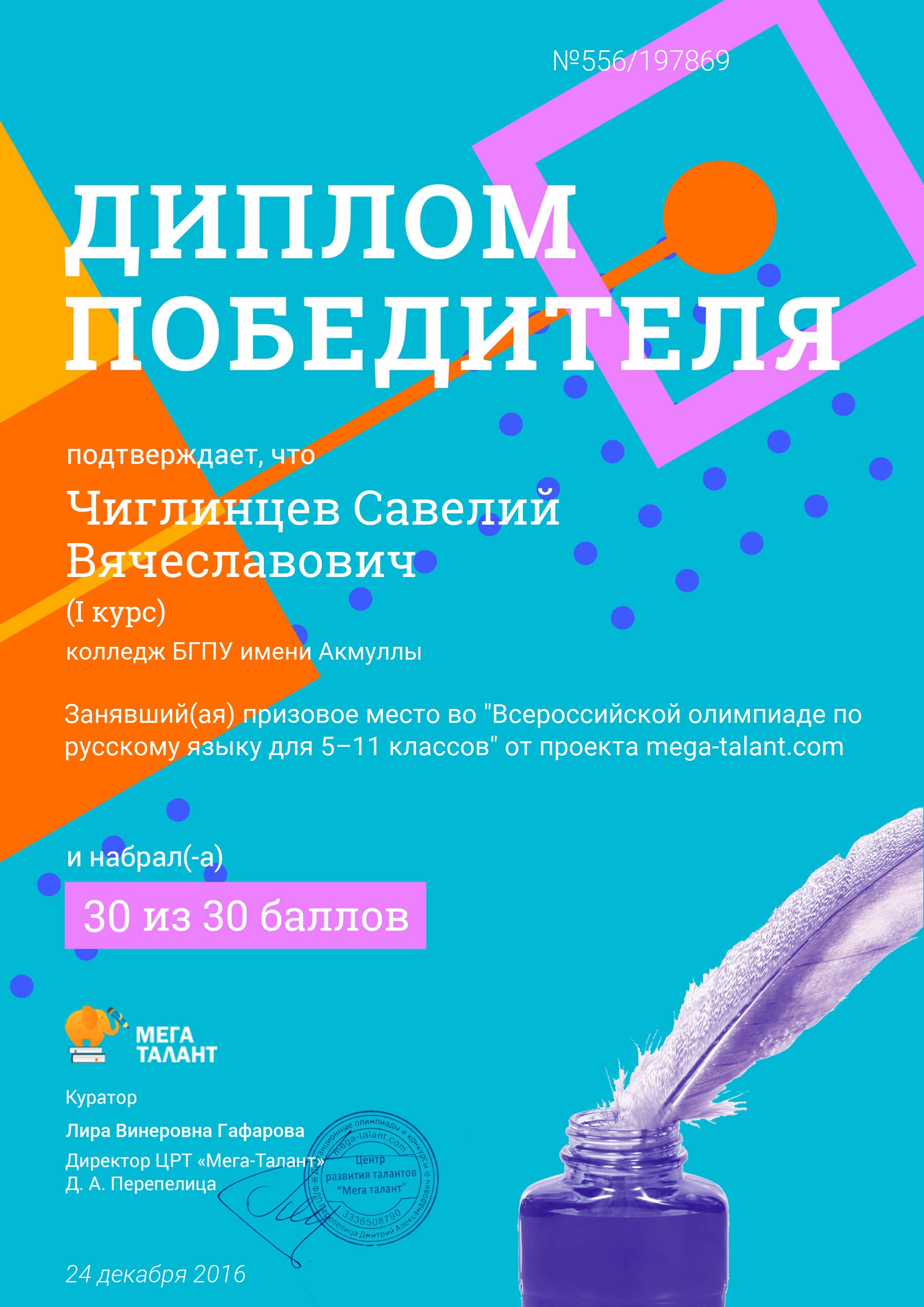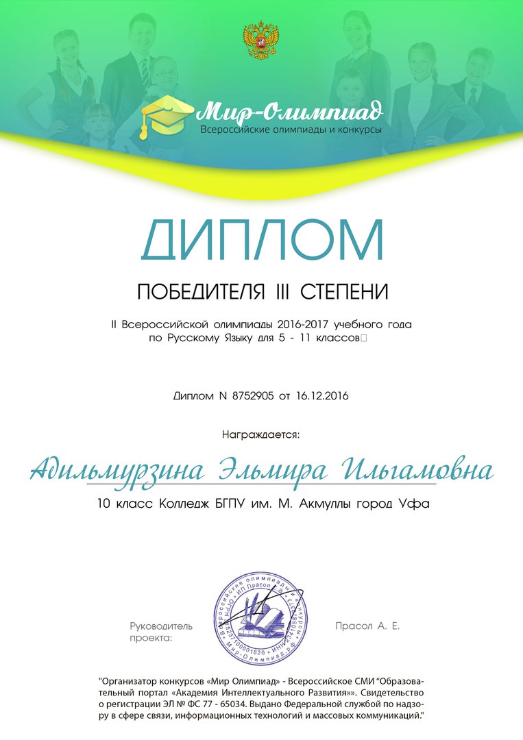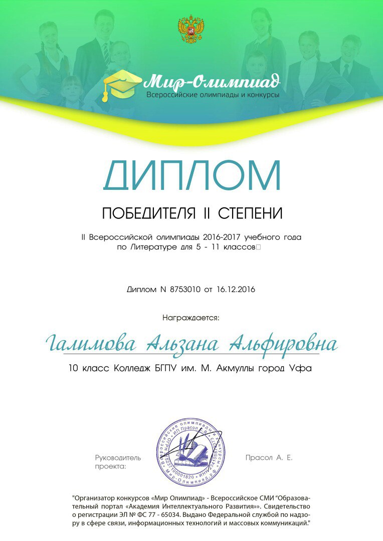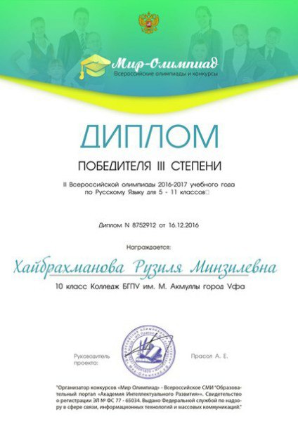 Поздравляем студентов Колледжа БГПУ им. М.Акмуллы (руководитель Л.В.Гафарова), занявших призовые места в олимпиадах по русскому языку и литературе! III Международный конкурс «Мириады открытий» проекта «Инфоурок» по русской и зарубежной литературе «Мифы разных времен и народов»: 1 место Мифтахова Д., Мухамадеева Е. – 9Б11. Международная олимпиада для школьников в режиме ОНЛАЙН на Международном интерактивном образовательном портале «Лидер»: 1 место Шамсутдинова Э. – 9Т-11, Тимаков К. – 9 ПО-11. 2 место Абдулов И. – 9Т-11. 3 место Булатова А. – 9Т-11, Габдулнафикова А. – 9Т-22. III Международный конкурс «Мириады открытий» проекта «Инфоурок» по русскому языку: 1 место Еникеева В., Зарипова Г. – 9Б-11. Международная онлайн-олимпиада на портале «Центр Европейского образования»: 2 место Мустафаева И. – 9Б-11. Всероссийская олимпиада по русскому языку от проекта mega-talant.com: 1 место Чиглинцев С., Фабарисова Н. – гр.9Т-11. 3 место Зилеева А. – гр. 9Т-11. II Всероссийская олимпиада по русскому языку на портале дистанционных олимпиад и конкурсов «Мир олимпиад»: 2 место Галимова А., Донковцева А., Панкратова А. – 9Э-11. 3 место Адильмурзина А., Гаянова А., Хайбрахманова Р. – 9Э-11. Всероссийская онлайн-олимпиада на сайте «Я - гений»: 1 место Конаева И. – 9Т-11. 2 место Сахипова К. – 9Т-11.