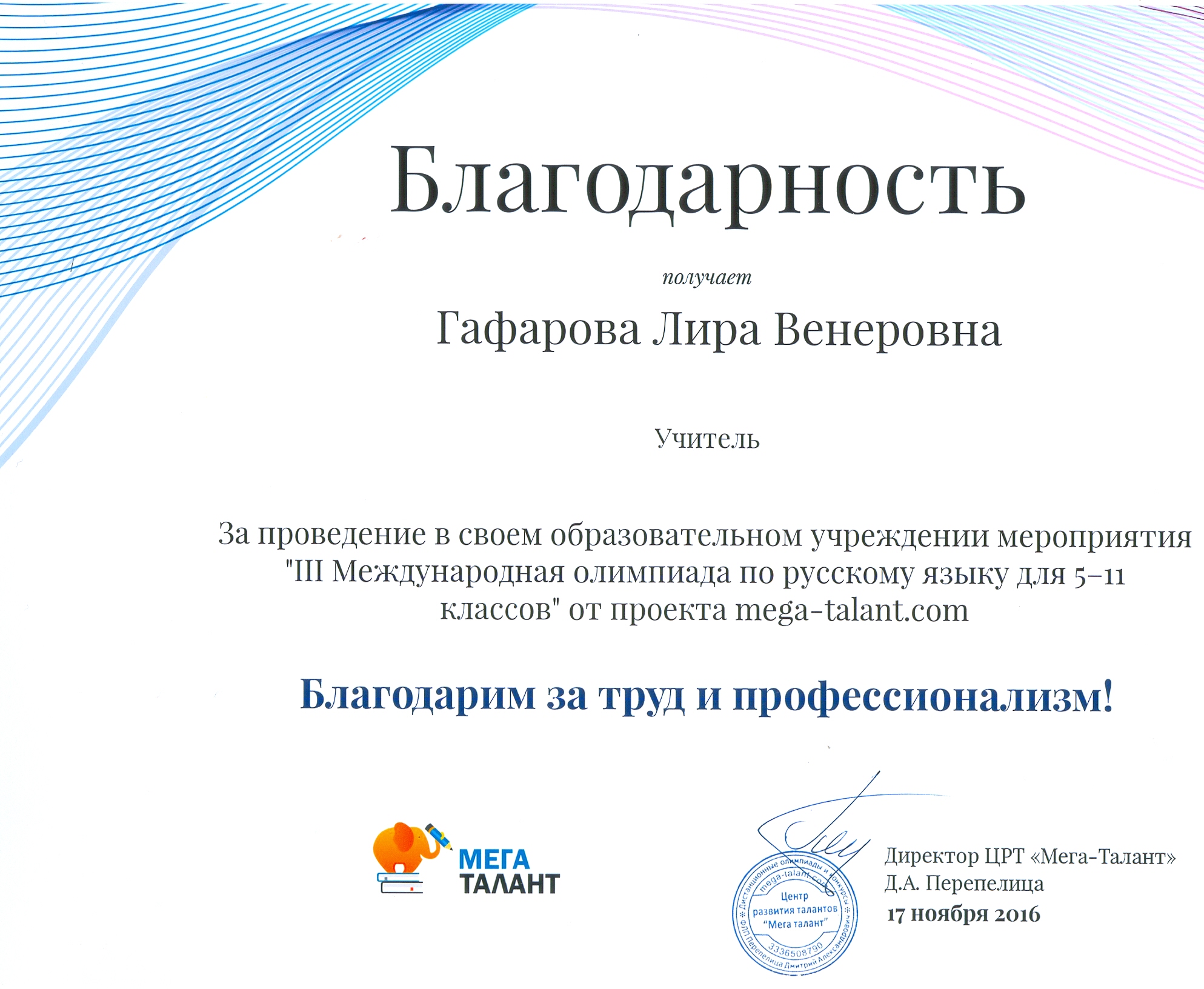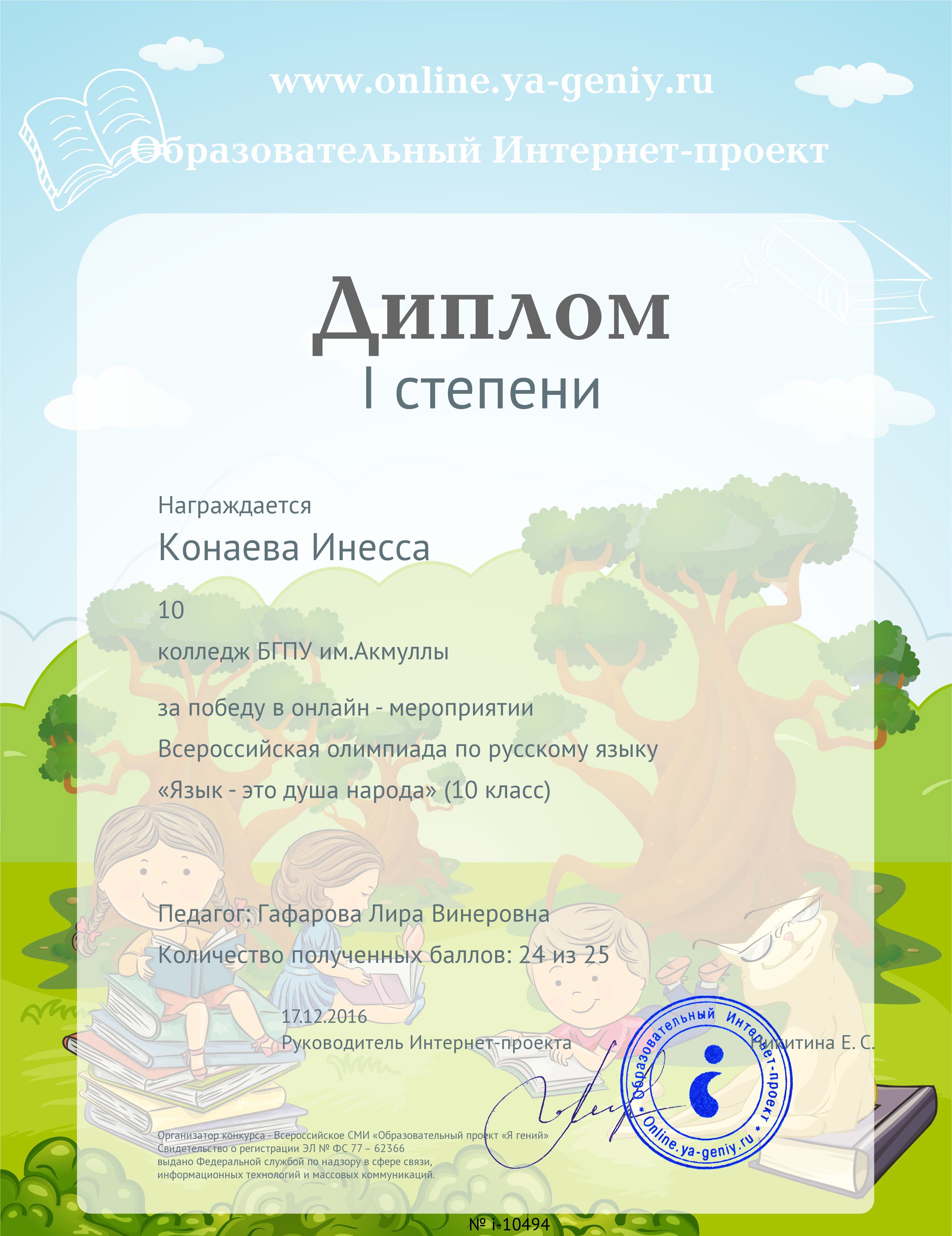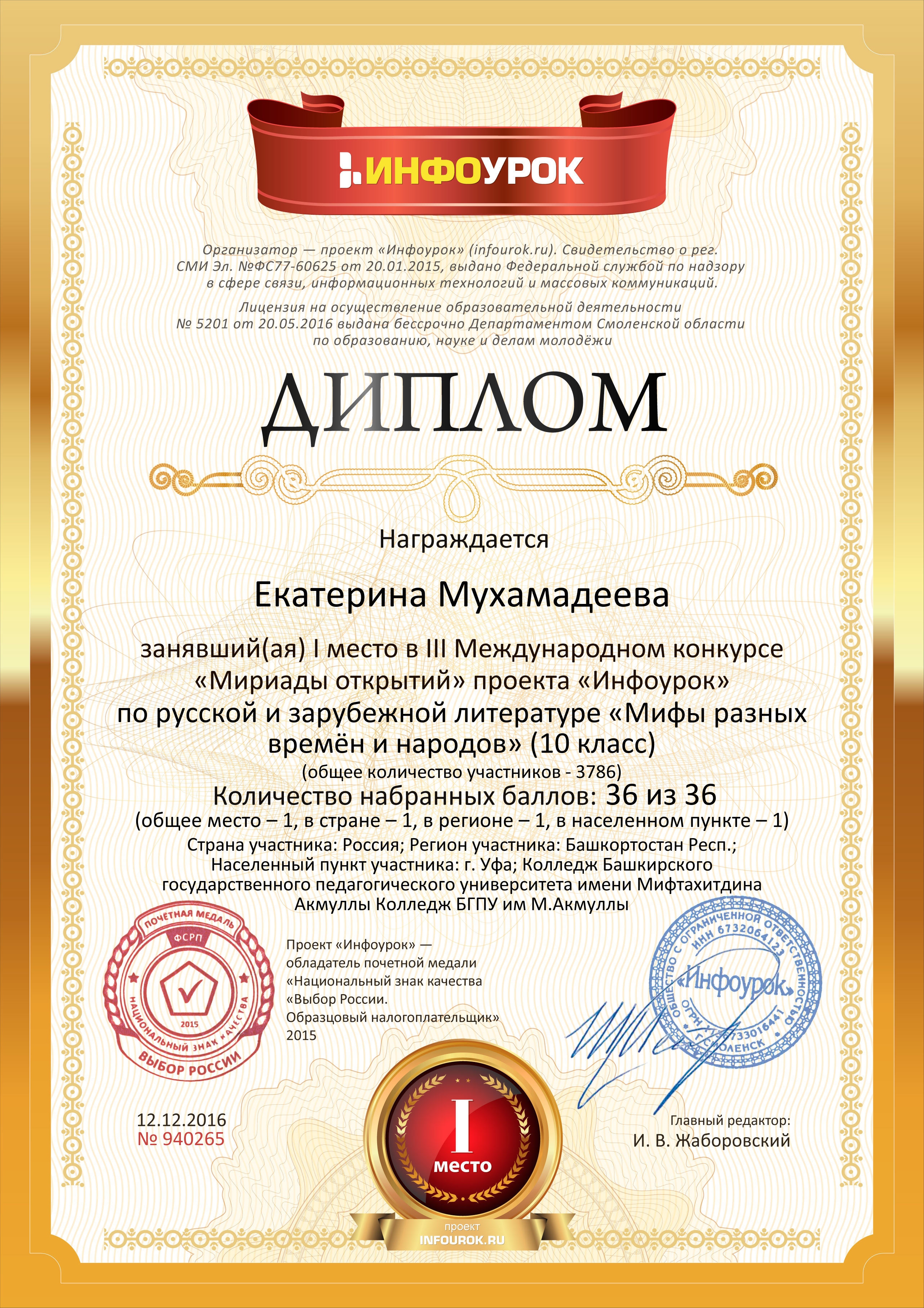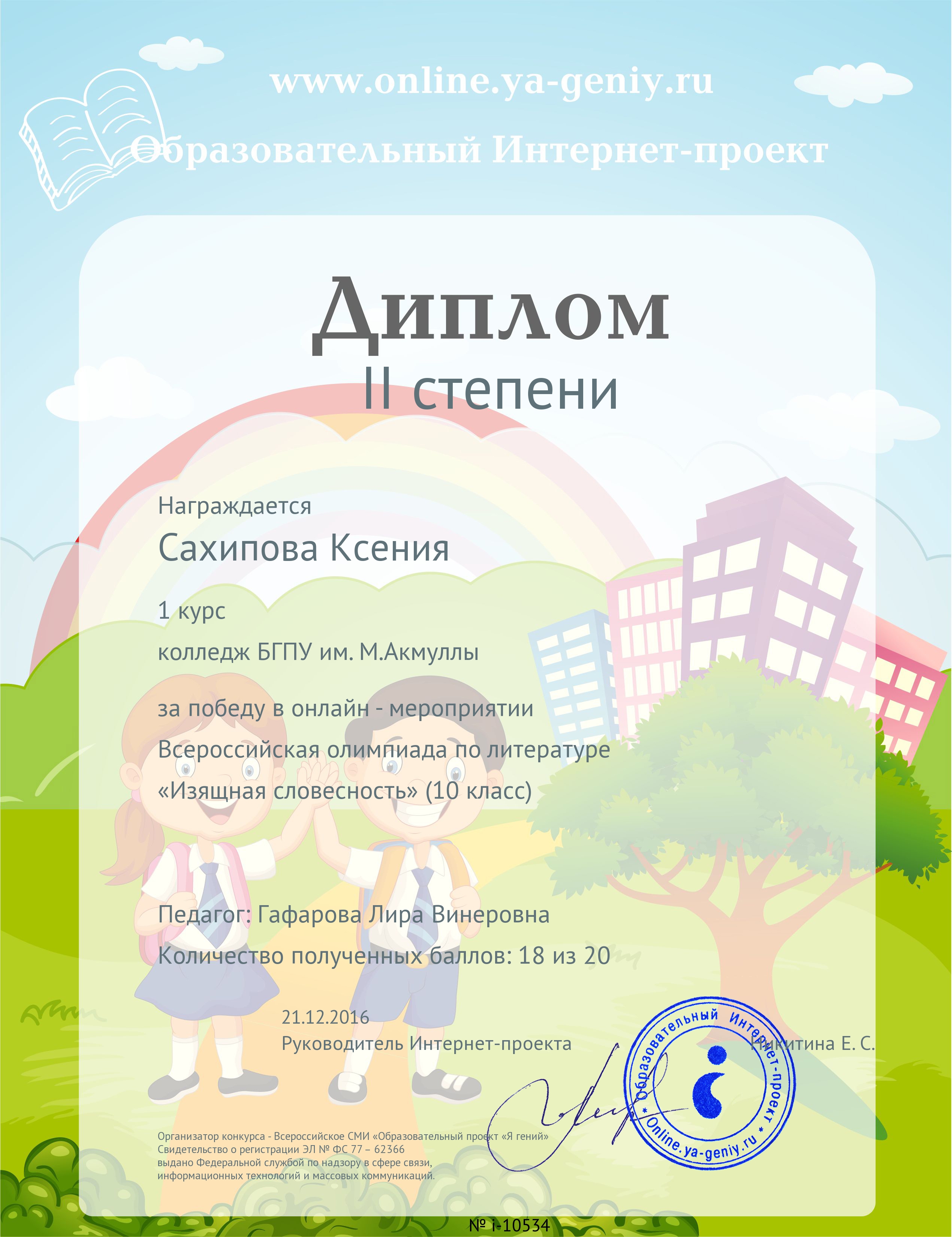 Поздравляем студентов Колледжа БГПУ им. М.Акмуллы (руководитель Л.В.Гафарова), занявших призовые места в олимпиадах по русскому языку и литературе! III Международный конкурс «Мириады открытий» проекта «Инфоурок» по русской и зарубежной литературе «Мифы разных времен и народов»: 1 место Мифтахова Д., Мухамадеева Е. – 9Б11. Международная олимпиада для школьников в режиме ОНЛАЙН на Международном интерактивном образовательном портале «Лидер»: 1 место Шамсутдинова Э. – 9Т-11, Тимаков К. – 9 ПО-11. 2 место Абдулов И. – 9Т-11. 3 место Булатова А. – 9Т-11, Габдулнафикова А. – 9Т-22. III Международный конкурс «Мириады открытий» проекта «Инфоурок» по русскому языку: 1 место Еникеева В., Зарипова Г. – 9Б-11. Международная онлайн-олимпиада на портале «Центр Европейского образования»: 2 место Мустафаева И. – 9Б-11. Всероссийская олимпиада по русскому языку от проекта mega-talant.com: 1 место Чиглинцев С., Фабарисова Н. – гр.9Т-11. 3 место Зилеева А. – гр. 9Т-11. II Всероссийская олимпиада по русскому языку на портале дистанционных олимпиад и конкурсов «Мир олимпиад»: 2 место Галимова А., Донковцева А., Панкратова А. – 9Э-11. 3 место Адильмурзина А., Гаянова А., Хайбрахманова Р. – 9Э-11. Всероссийская онлайн-олимпиада на сайте «Я - гений»: 1 место Конаева И. – 9Т-11. 2 место Сахипова К. – 9Т-11.