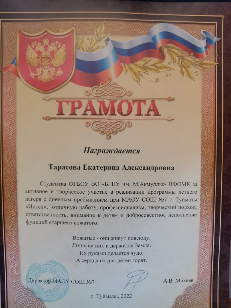 Вожатскую практику она проходила в МАОУ СОШ №7 г. Туймазы. Еще на практических занятиях мы наблюдали, с каким желанием и интересом наша Екатерина рвалась в детский лагерь. У нее был готов весь арсенал методических игр, сборник лагерных песен и самое главное – желание работать с детьми. И вот главный результат: грамота от руководства лагеря, где сказано о высоком профессионализме нашей студентки и слова благодарности в адрес ректора С.Т. Сагитову за реализацию качественного педагогического образования и лучший преподавательский состав БГПУ им. М. Акмуллы.