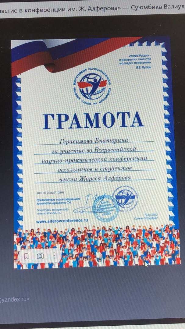Представленная работа получила поощрительную грамоту. Желаем Екатерине  и ее научному руководителю А.Х. Ахмедьяновой покорения новых научных высот!