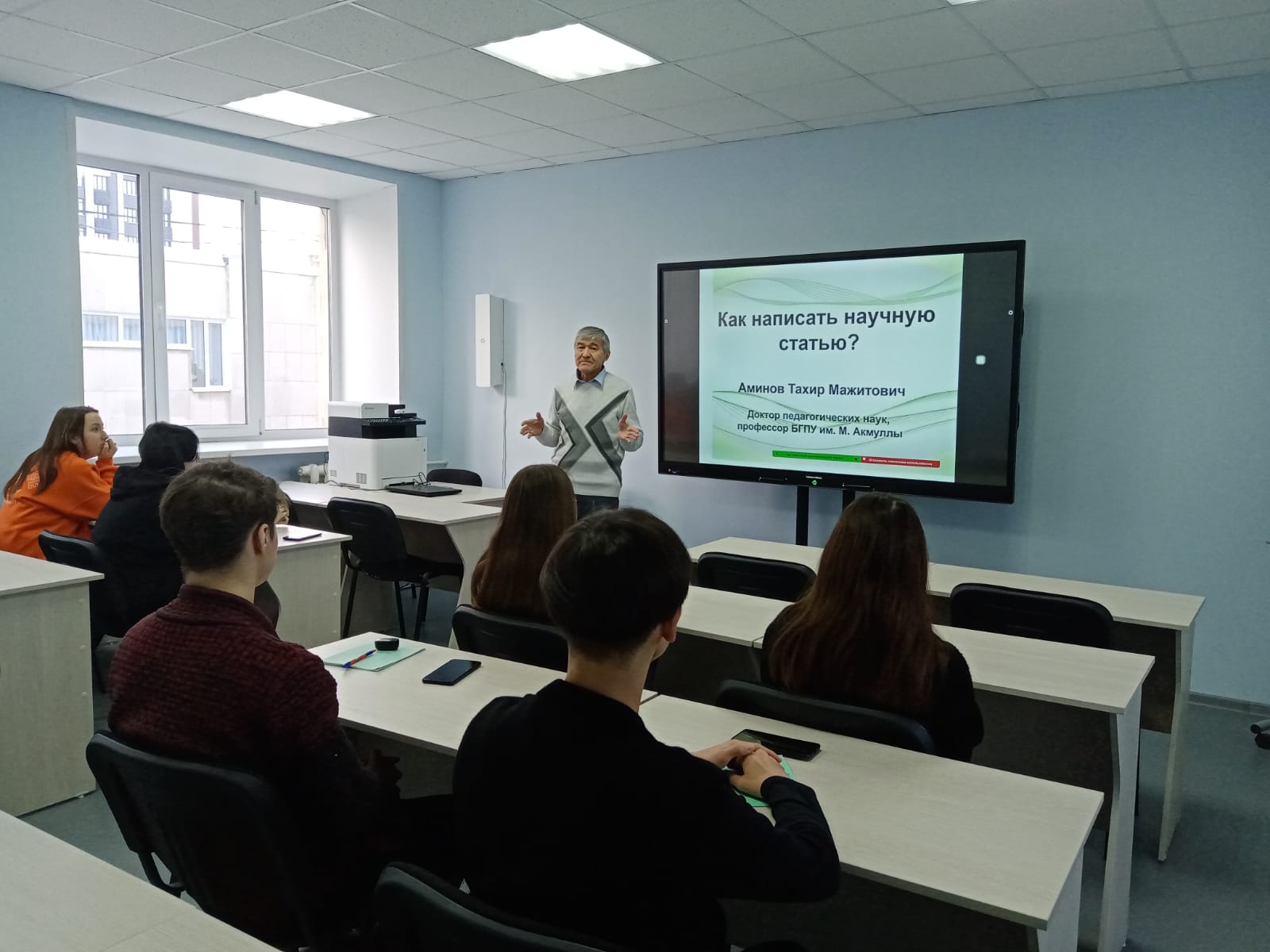 Профессор кафедры педагогики Аминов Тахир Мажитович для них провел мастер-класс «Первые шаги в науку». Целью мероприятия является знакомство учащихся с теоретическими основами изучаемого вопроса и изучение методики работы над статьей.