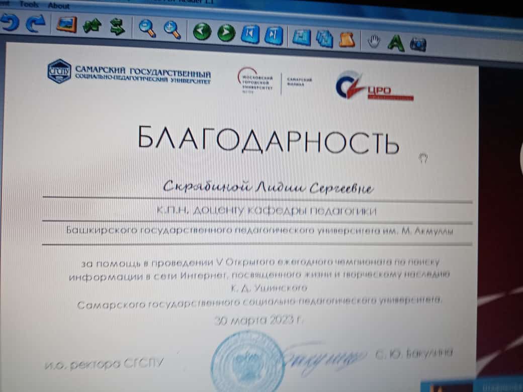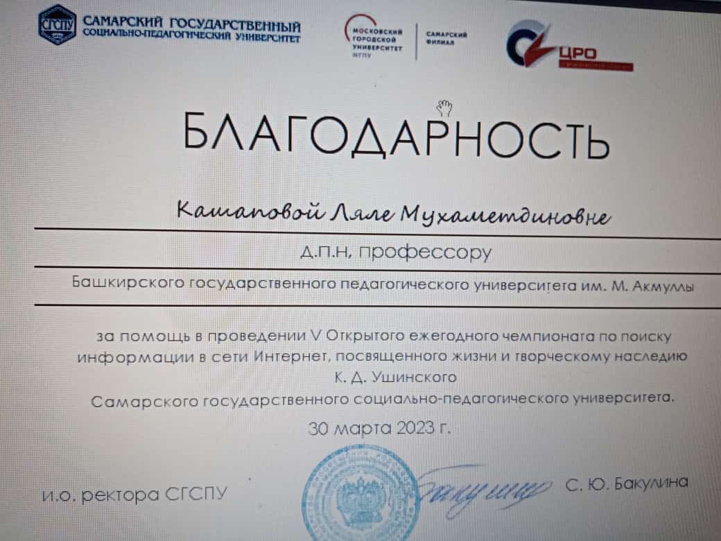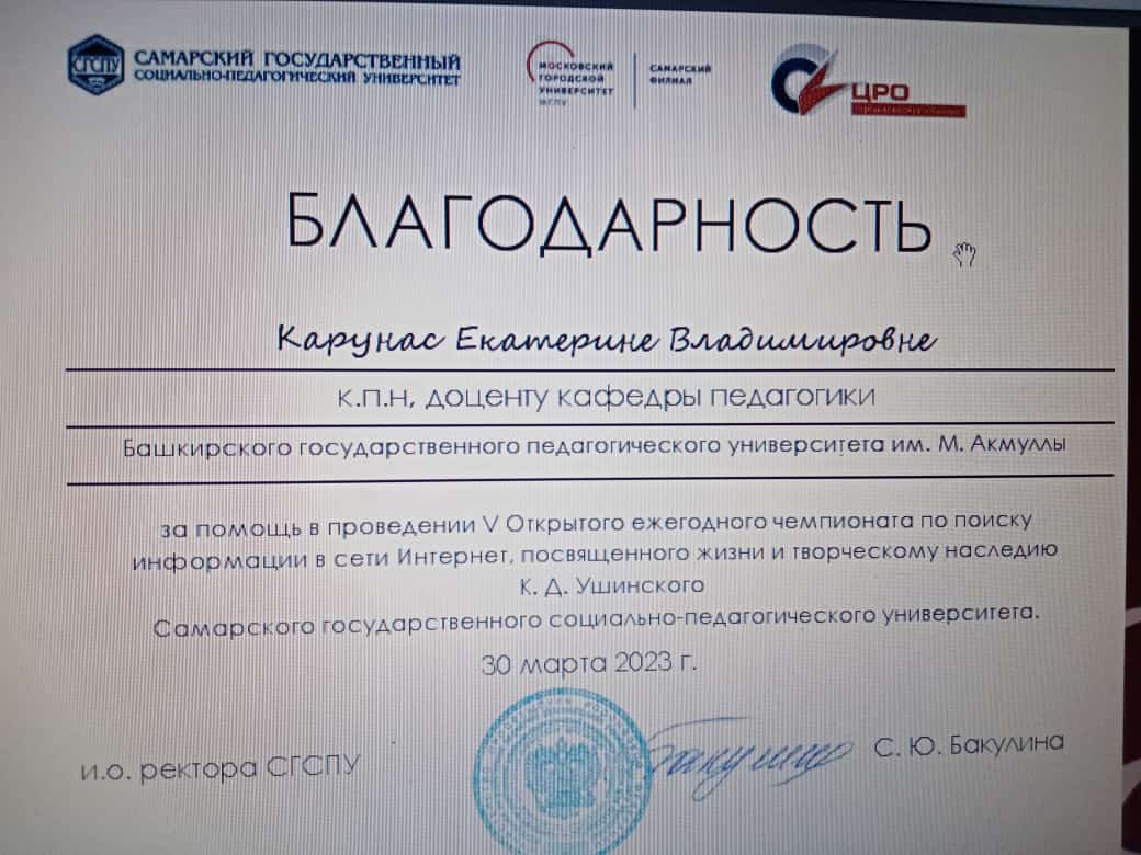 Самарский государственный социально-педагогический университет выразил благодарность и.о. зав. кафедрой педагогики Ахмедьяновой А.Х., профессору Кашаповой Л.М. и доцентам Скрябиной Л.С., Карунас Е.В., Гирфановой Л.П., Нурихановой Н.К.  за помощь в проведении 30 марта 2023 г. V Открытого ежегодного чемпионата по поиску информации в сети Интернет, посвященного жизни и творческому наследию К.Д. Ушинского.