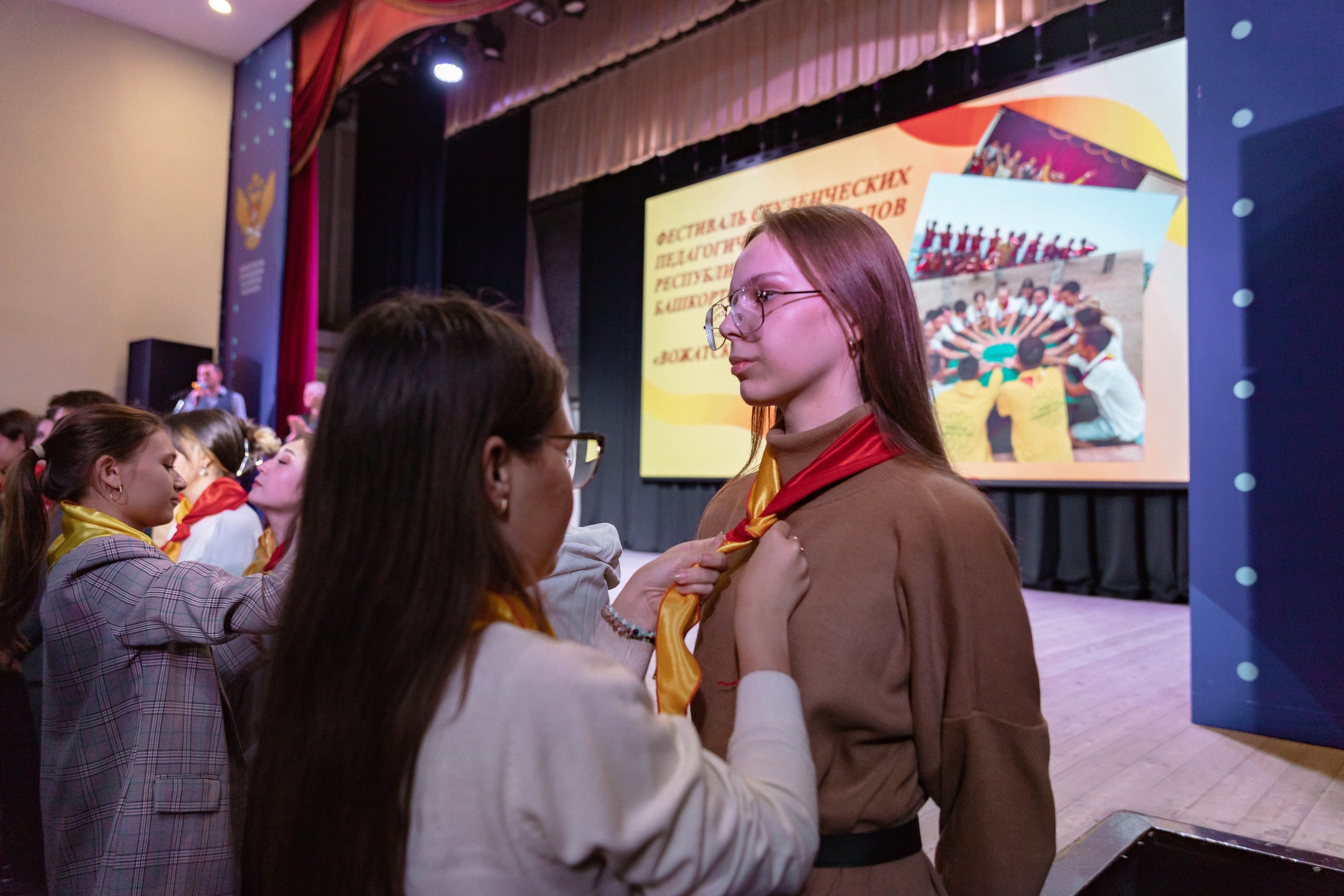 Далее Амина Рахматуллина от имени руководства Центра вручила дипломы лучшим бойцам – командирам третьего трудового семестра 2022-2023 учебного года. Командиры, в свою очередь, повязали студентам 3 курса фирменные красно-желтые галстуки центра вожатых «Перспектива».