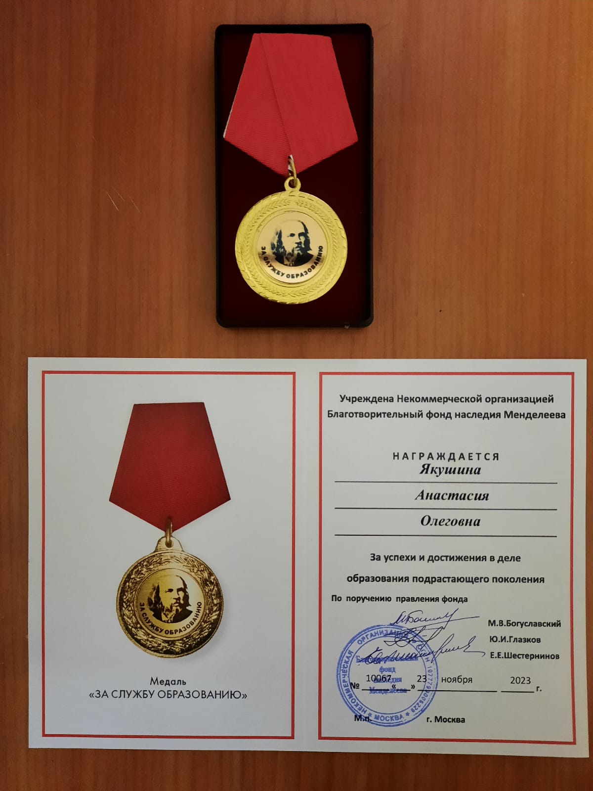 Якушина Анастасия Олеговна, студентка 1 курса Института педагогики, группы ОЗПВРИ-11-23 заняла 1 место во Всероссийском конкурсе профессионального мастерства педагогов "Мой лучший урок" и получила медаль "За службу образованию" от благотворительного фонда наследия Менделеева.
