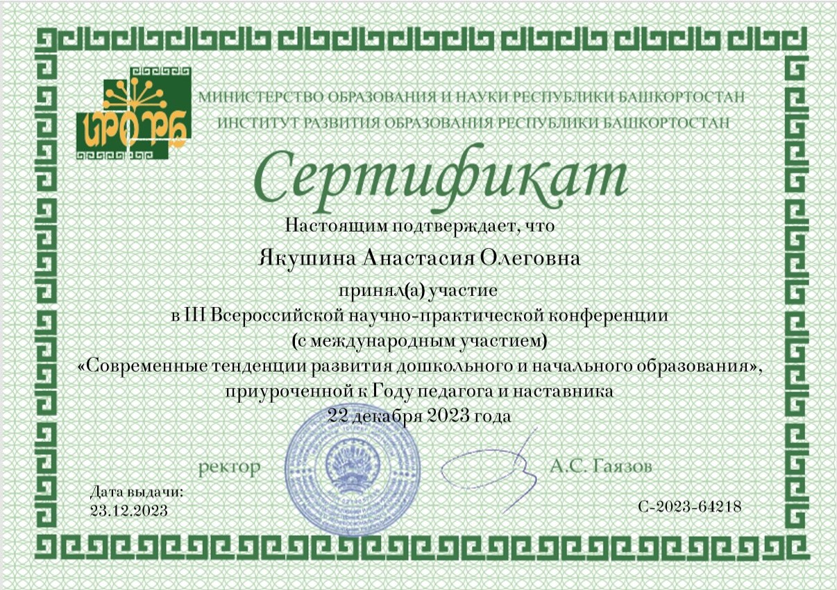 21 декабря 2023 г. студентка Института педагогики, группы ОЗПВРИ-11-23 (учитель начальных классов МОБУ СОШ №6 им. М.А. Киняшова г. Благовещенска) Якушина Анастасия приняла участие в роли спикера в III Всероссийской научно-практической конференции (с международным участием) на базе Институра развития образования Республики Башкортостан. Она является молодым педагогом, поэтому совместно со своим наставником была в секторе, который назывался "Наставничество". Спикерами были заведующие ДО, молодые и с большим опытом директора школ, гимназий РБ. Все делились своим опытом наставничества. Анастасия представили тему "Формы наставничества  в работе педагога "учитель -учитель", "учитель - ученик", поделившись своим опытом работы с детьми и педагогом-наставником. За участие были награждены сертификатом.