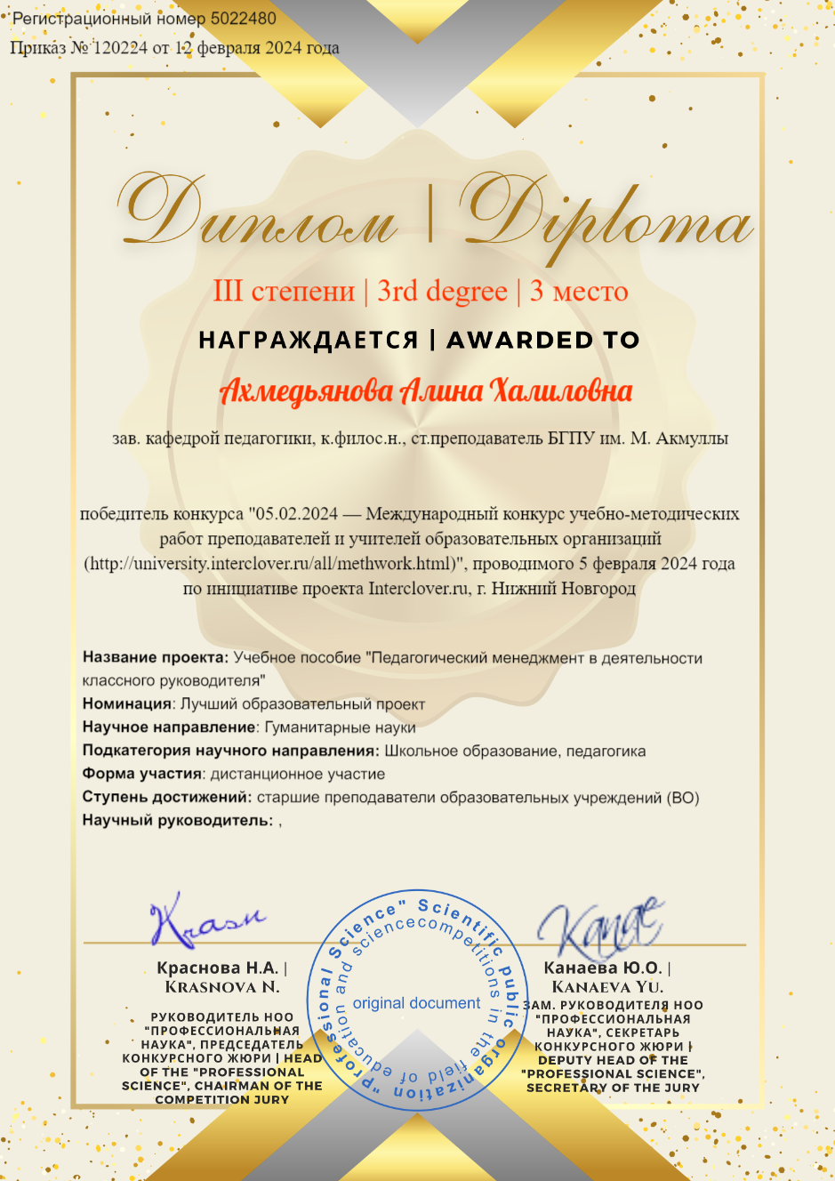 Старший преподаватель кафедры педагогики Ахмедьянова Алина Халиловна признана победителем Международного конкурса учебно-методических работ преподавателей и учителей образовательных организаций (5 февраля 2024, г. Нижний Новгород). Номинация: Лучший образовательный проект. Название проекта: Учебное пособие "Педагогический менеджмент в деятельности классного руководителя"