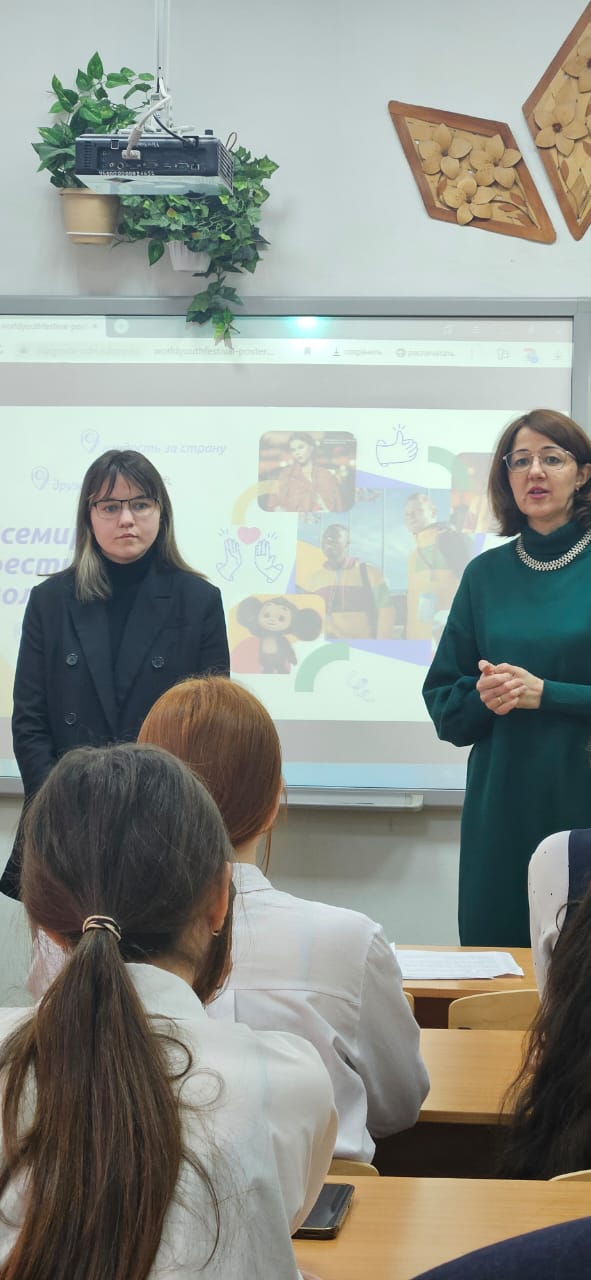 26 февраля доцент кафедры педагогики Н.К. Нуриханова и студентка 3 курса ФП А. Климова провели для обучающихся 9 А класса внеурочное занятие «Разговор о важном» на тему «Всероссийский фестиваль молодёжи»