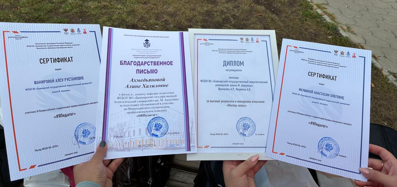 С 06.10.2025 по 08.10.2025 гг. студентки 3 курса, группы ОЗПВРИС-31-23 Шакирова Алсу Рустамовна и Якушина Анастасия Олеговна, участвовали во Всероссийском студенческом профессиональном конкурсе "#ЯПедагог" в г.Оренбург. Наставник команды - доцент кафедры педагогики Алина Халиловна Ахмедьянова.