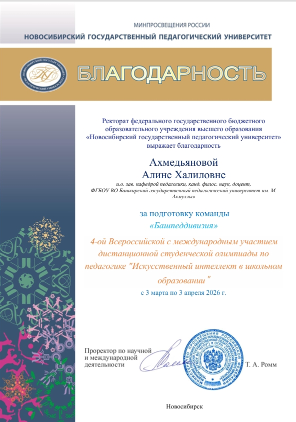 Алина Халиловна получила благодарственное письмо в качестве эксперта олимпиады. Благодарственным письмом был награжден и наш ректор Салават Талгатович Сагитов за эффективное развитие и поддержку инновационных форм обучения студентов БГПУ им.М.Акмуллы.