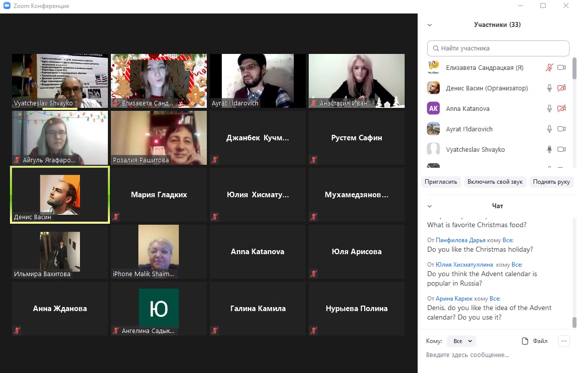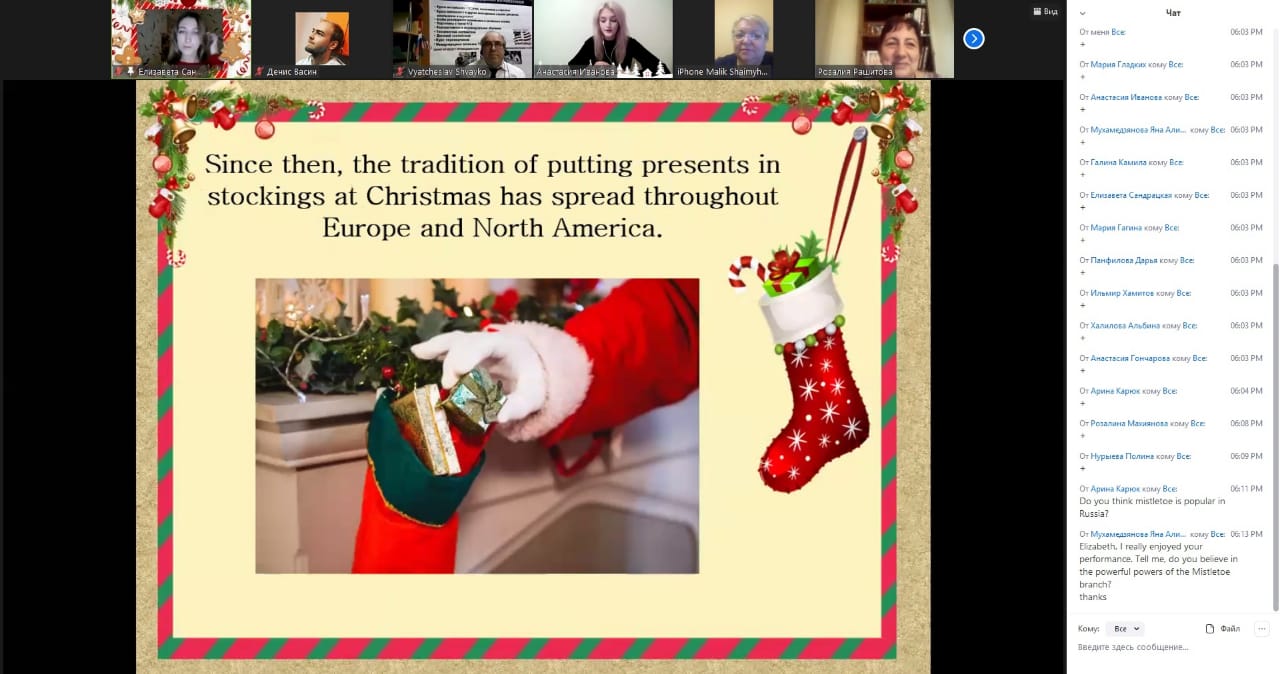 22 декабря кафедра иностранных языков ИФОМК на платформе Zoom провела учебно-воспитательное мероприятие “English Christmas” («Английское Рождество»), в котором приняли участие 25 студентов неязыковых институтов и факультетов БГПУ им. М. Акмуллы. Были заслушаны доклады на английском языке, просмотрены красочные презентации. Онлайн встреча прошла в незабываемой праздничной атмосфере. В очередной раз коллектив кафедры выражает огромную благодарность доценту Вячеславу Дмитриевичу Швайко за неоценимую помощь в проведении мероприятия!