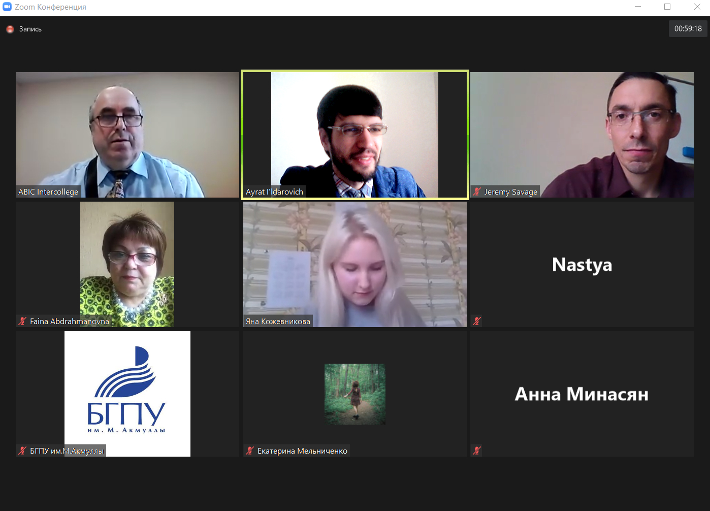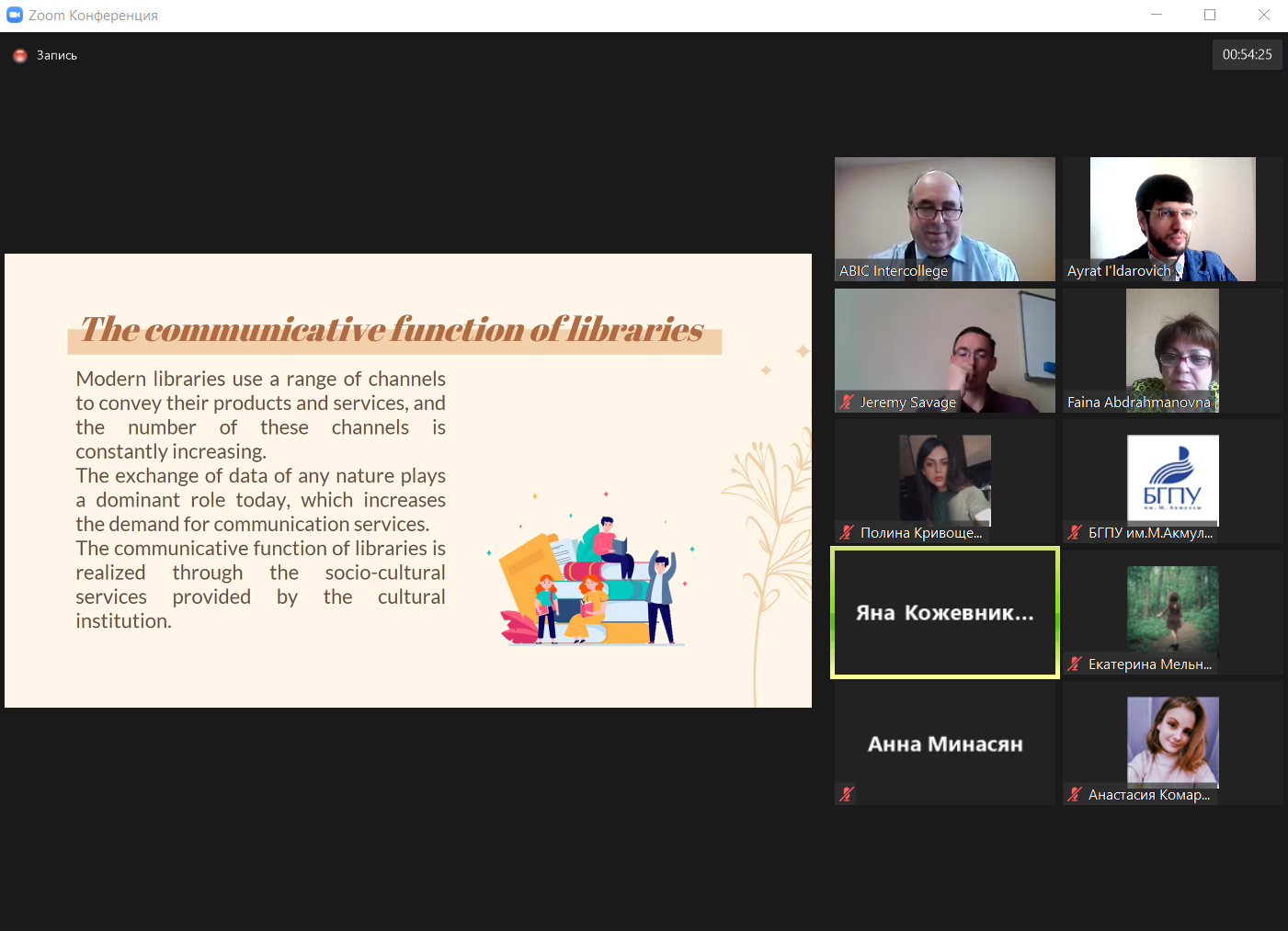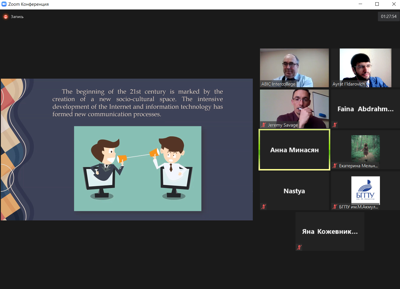 На 34-й учебной неделе в БГПУ им. М. Акмуллы в дистанционном формате прошла международная конференция Ч.О.К.С. («Человек. Общество. Культура. Социализация»). 23 апреля в 10:00 на английском языке с приветственным словом к участникам конференции обратилась старший преподаватель Американо-Башкирского Интерколледжа Элизабет Перл Хьюз, раскрывшая в своем выступлении преимущества обучения в многонациональном и мультикультурном обществе. Позже в 13:00 началась секционная работа. В этом году преподавателями кафедры иностранных языков была организована секция «Current issues in the humanities and social sciences», руководителем которой был избран доцент Вячеслав Дмитриевич Швайко. Студенты разных институтов и факультетов БГПУ им. М. Акмуллы (Кривощекова Полина, Кожевникова Яна, Латыпова Алсу, Обухова Полина, Мельниченко Екатерина, Минасян Анна, Комарова Анастасия) выступили на английском языке с докладами, посвященными актуальным научным темам из таких сфер, как WorldSkills, логопедия, библиотечное дело, социальные сети, психологическая поддержка. После каждого выступления старший преподаватель Американо-Башкирского Интерколледжа Джереми Саваж задавал вопросы на английском языке по тематике заслушанной статьи. Это онлайн мероприятие было организовано и проведено следующими преподавателями кафедры иностранных языков: В.Д. Швайко, Ф.А. Хуснутдинова, А.И. Шагапов. Статьи на английском языке в соавторстве со студентами были подготовлены профессорами Е.А. Мороз и В.Л. Бениным, доцентами Р.А. Гильмияновой и Ф.А. Хуснутдиновой, старшими преподавателями А.Г. Коптюх и Л.Ф. Валеевой. Статьи следующих студентов и школьников (помимо указанных выше) были включены в сборник по материалам данной международной конференции (статус - РИНЦ): Д.Ю. Захарова, Д.В. Лантух, М.Б. Шакирова, Р.А. Коптюх, М.В. Старостина, Н.Н. Крюкова, К.Я. Касимова, А.И. Ибрагимова, Н.Е. Костригина.
