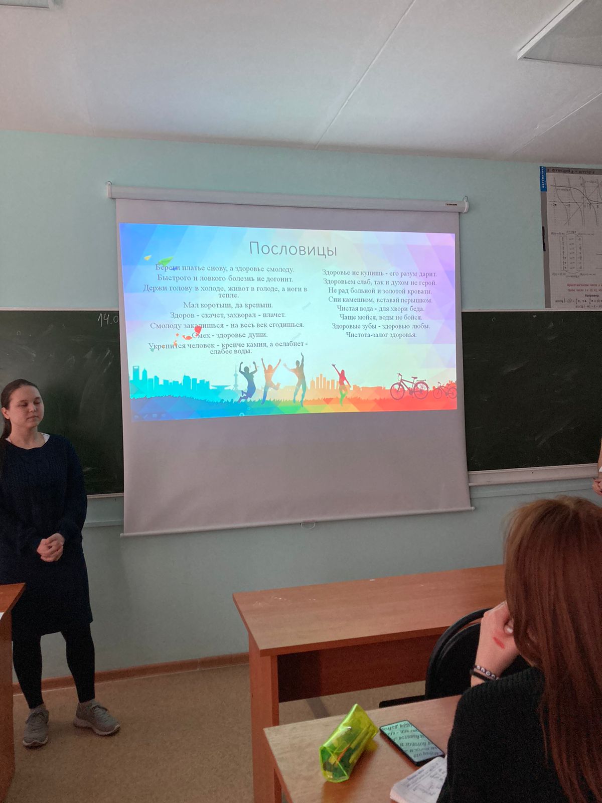 18 апреля на занятии со студентами группы ПОМИ-11-21 (ИФМЦНТ) А.Г. Коптюх были заслушаны доклады с красочными презентациями: "Здоровое питание", "Спорт в нашей жизни", "Пословицы о здоровье", "Энергетическая ценность продуктов". Также студентам было предложено ответить на вопросы теста и заполнить тематический кроссворд.