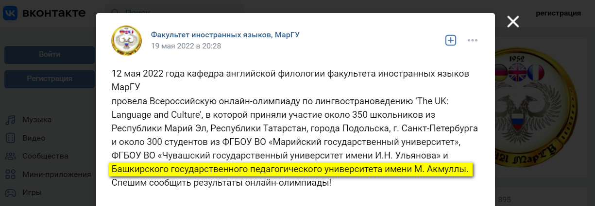 12 мая студенты неязыковых факультетов и институтов Акмуллинского университета приняли участие во Всероссийской онлайн-олимпиаде по лингвострановедению “The UK: Language and Culture”, организованной кафедрой английской филологии факультета иностранных языков Марийского государственного университета (https://vk.com/ffl_marsu?w=wal...).