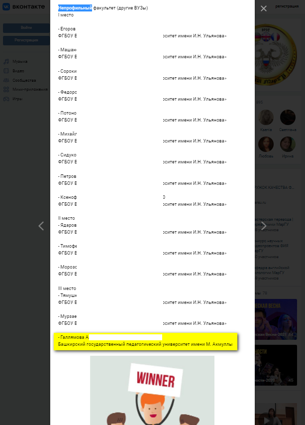 Также хотелось бы особо отметить следующих студентов, набравших наибольшее количество баллов: Д. Авила, Г. Антипина, Ю. Байназарова, Е. Божко, Г. Галиуллина, Е. Карманникова, З. Кодиров, М. Марченко, Э. Назырова.