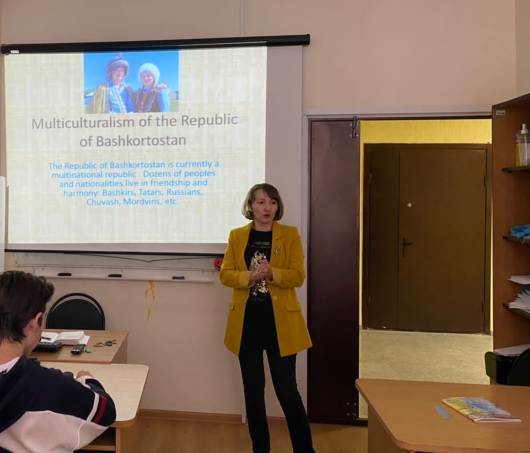 12 октября в ИФМЦН старший преподаватель А.Р. Цыпина на основе информативной презентации провела занятие с группой ПИНФ-31-20 на тему: "The Republic of Bashkortostan". Студенты ознакомились с познавательным материалом по истории своего родного края и даже подискутировали относительно некоторых вопросов. В конце тематической встречи был успешно пройден тест на проверку усвоения новых знаний.