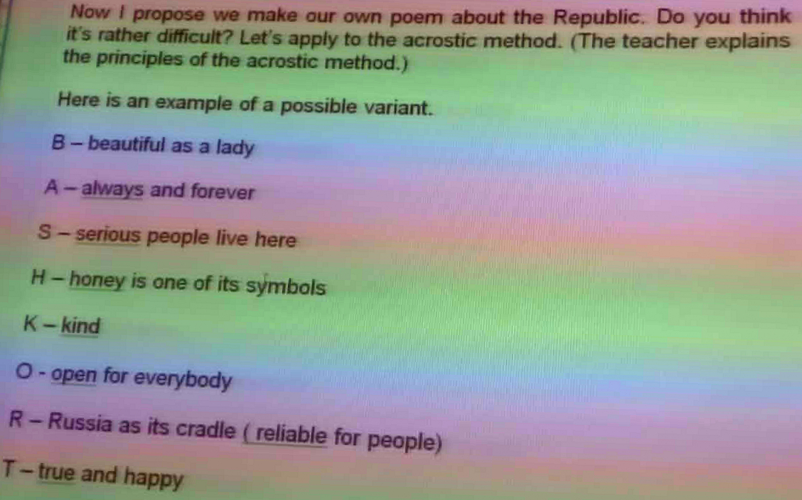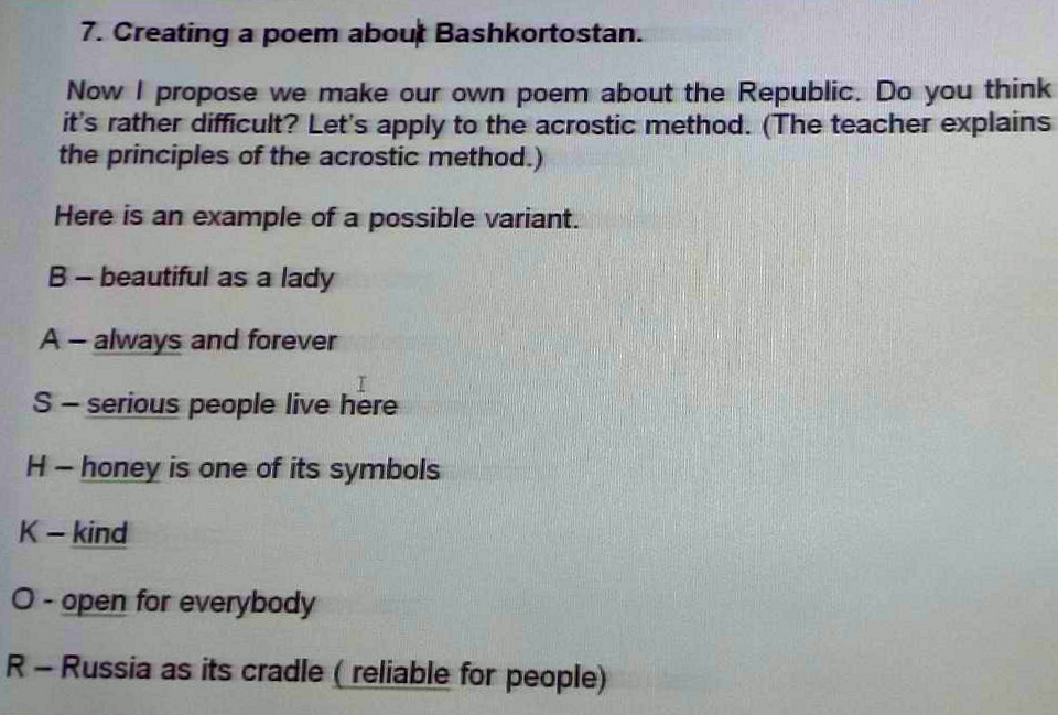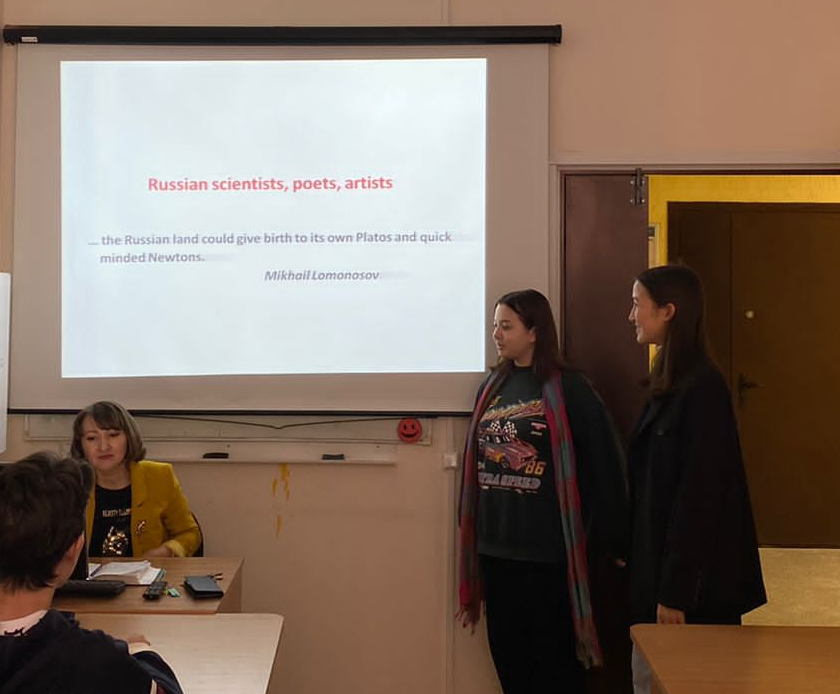 7 октября в ИФМЦН было проведено занятие «Моя Родина – Республика Башкортостан» у группы ПМФ-11-22. Были заслушаны два информативных доклада, сопровождаемых презентациями («Культурное наследие Республики», «Известные деятели Башкортостана»). Студенты также посмотрели видеоролики на английском языке: «My Ufa», «Republic of Bashkortostan». На второй половине пары студенты поделились на две команды и приступили к сочинению стихотворений по начальным буквам названия Республики Башкортостан. В конце занятия старший преподаватель Альбина Галиевна Коптюх подвела итоги, задала контрольные вопросы. Лучшая команда получила заслуженный приз – отличные баллы по дисциплине.