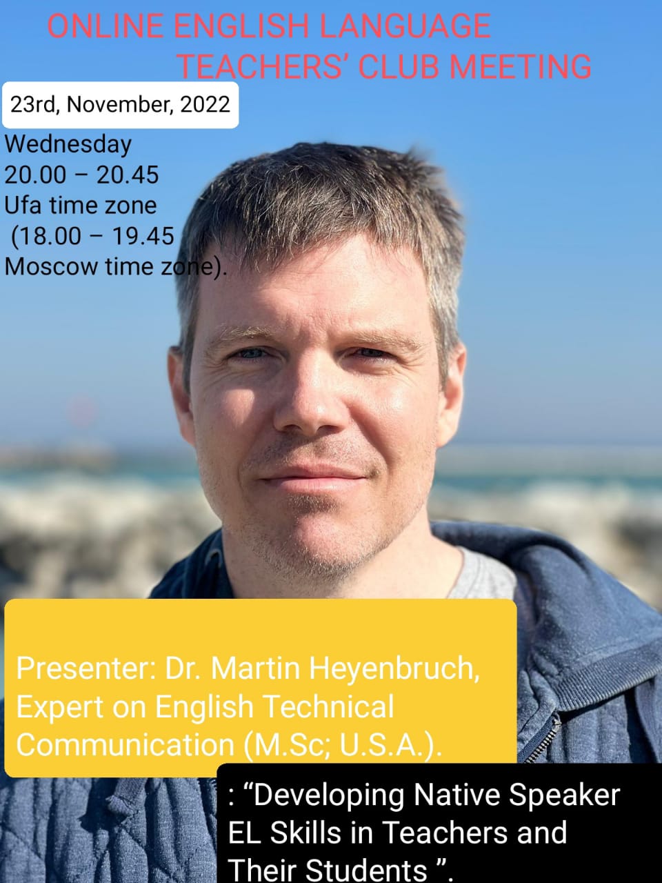 23 ноября 2022 года в рамках очередной онлайн встречи Клуба учителей английского языка (организаторы: к.филол.н., доцент кафедры межкультурной коммуникации и перевода В.Д. Швайко и АНО ДО "Интерколледж") преподаватели кафедры иностранных языков посетили семинар “Developing Native Speaker EL Skills in Teachers and Their Students”. В роли докладчика выступил носитель языка Мартин Хайенбрух.
