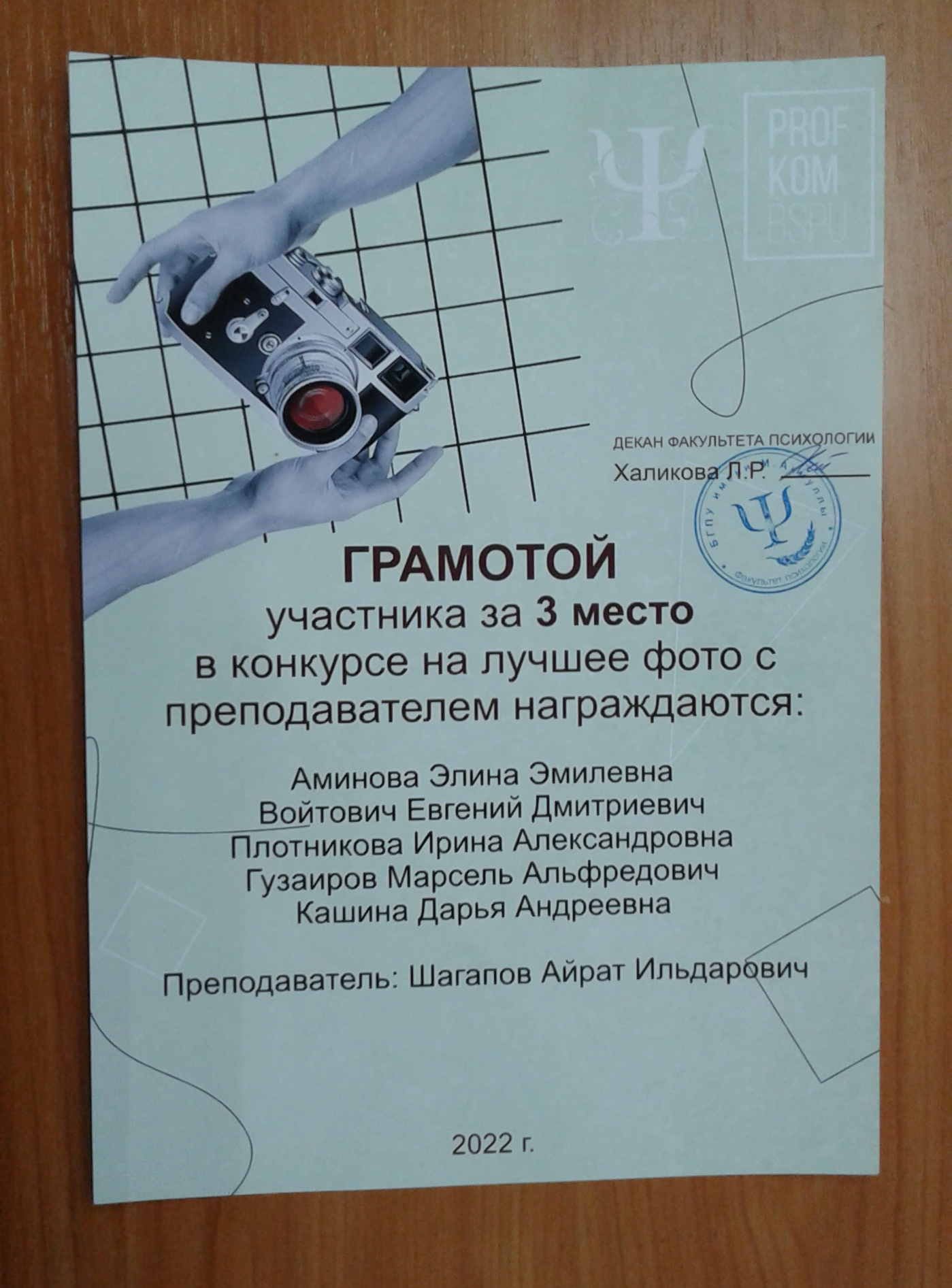 Кафедре иностранных языков было присуждено III место по итогам конкурса на лучшую фотографию с преподавателем. Мероприятие было проведено Факультетом Психологии БГПУ им. М. Акмуллы.