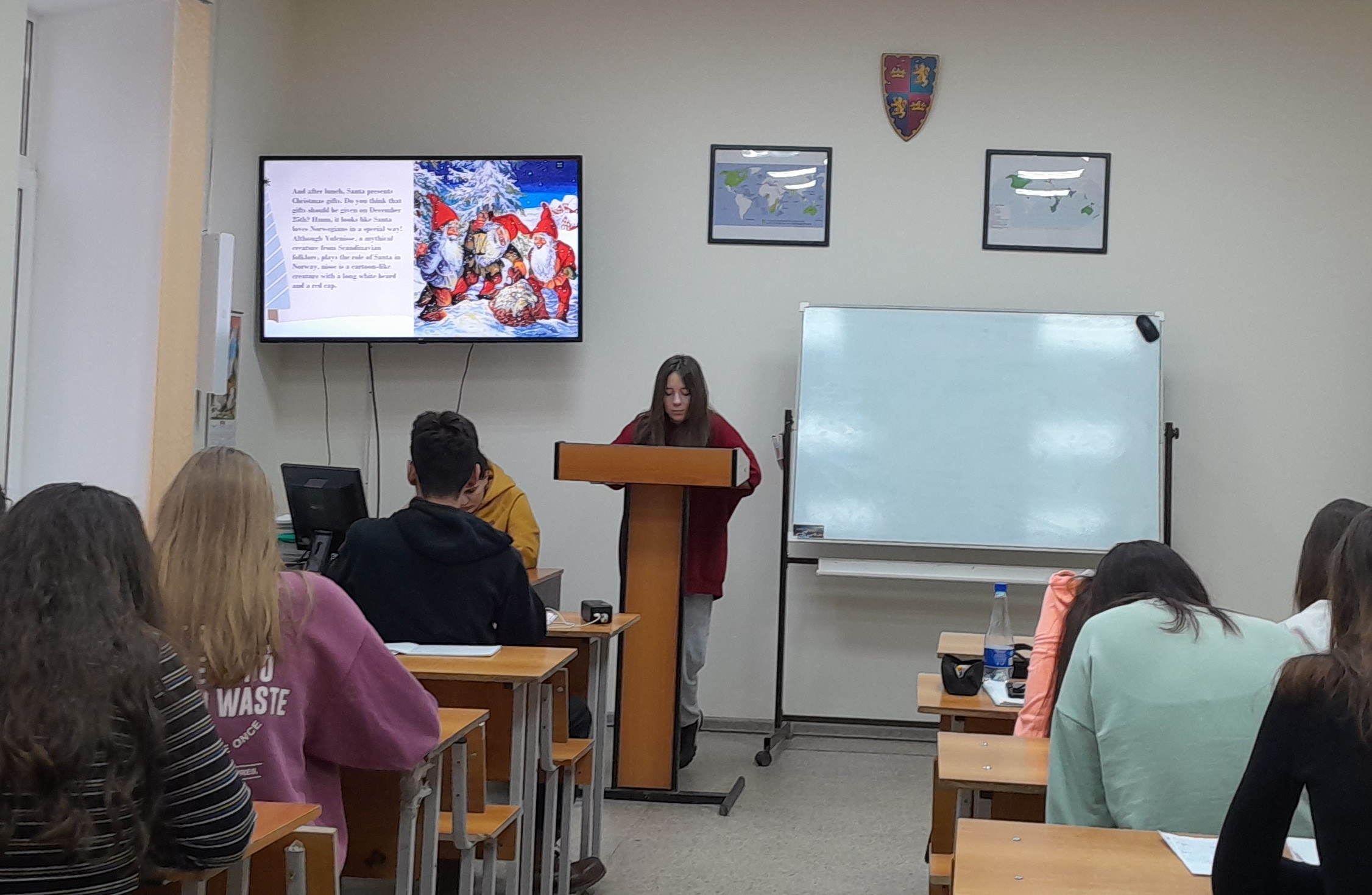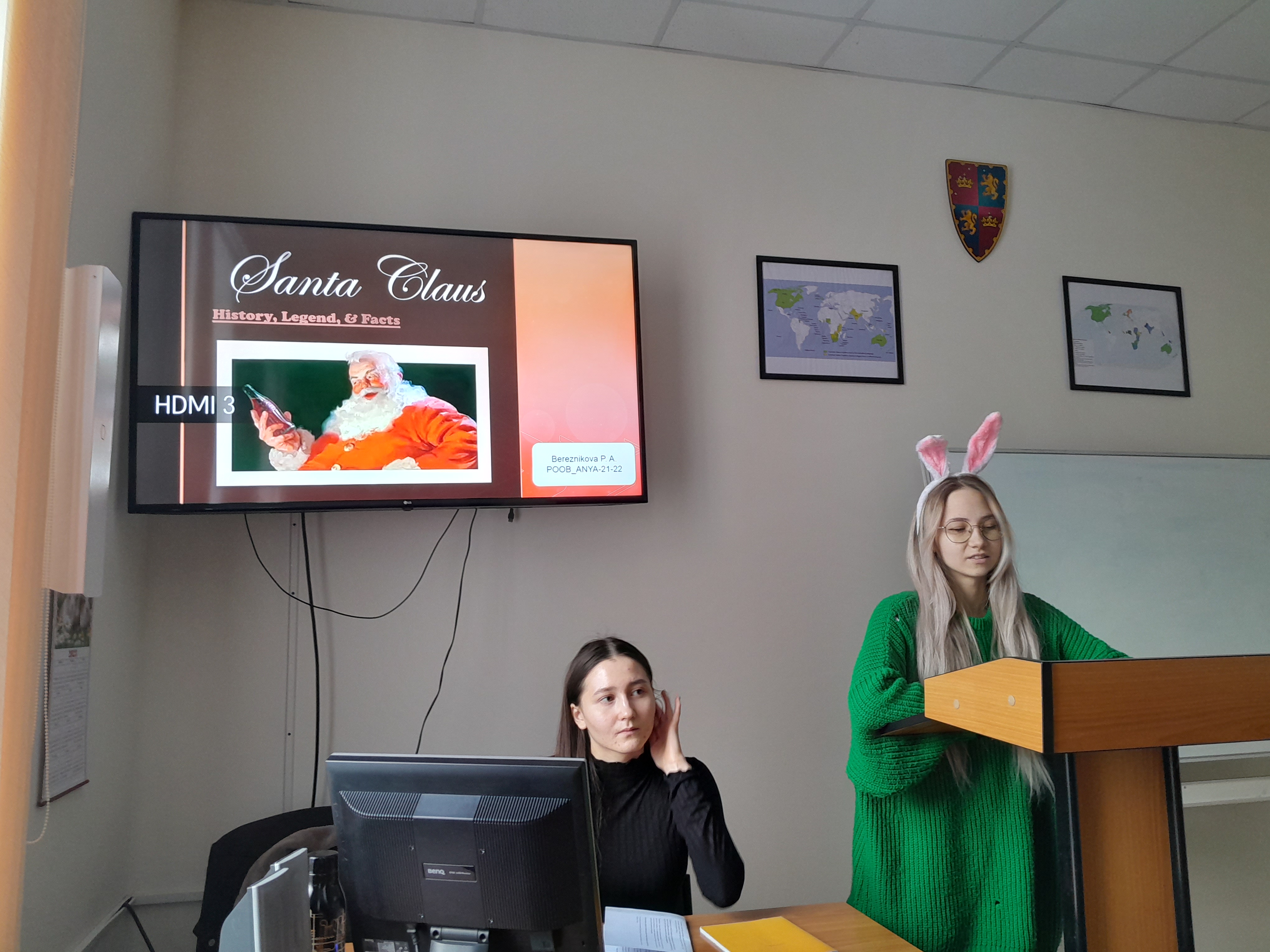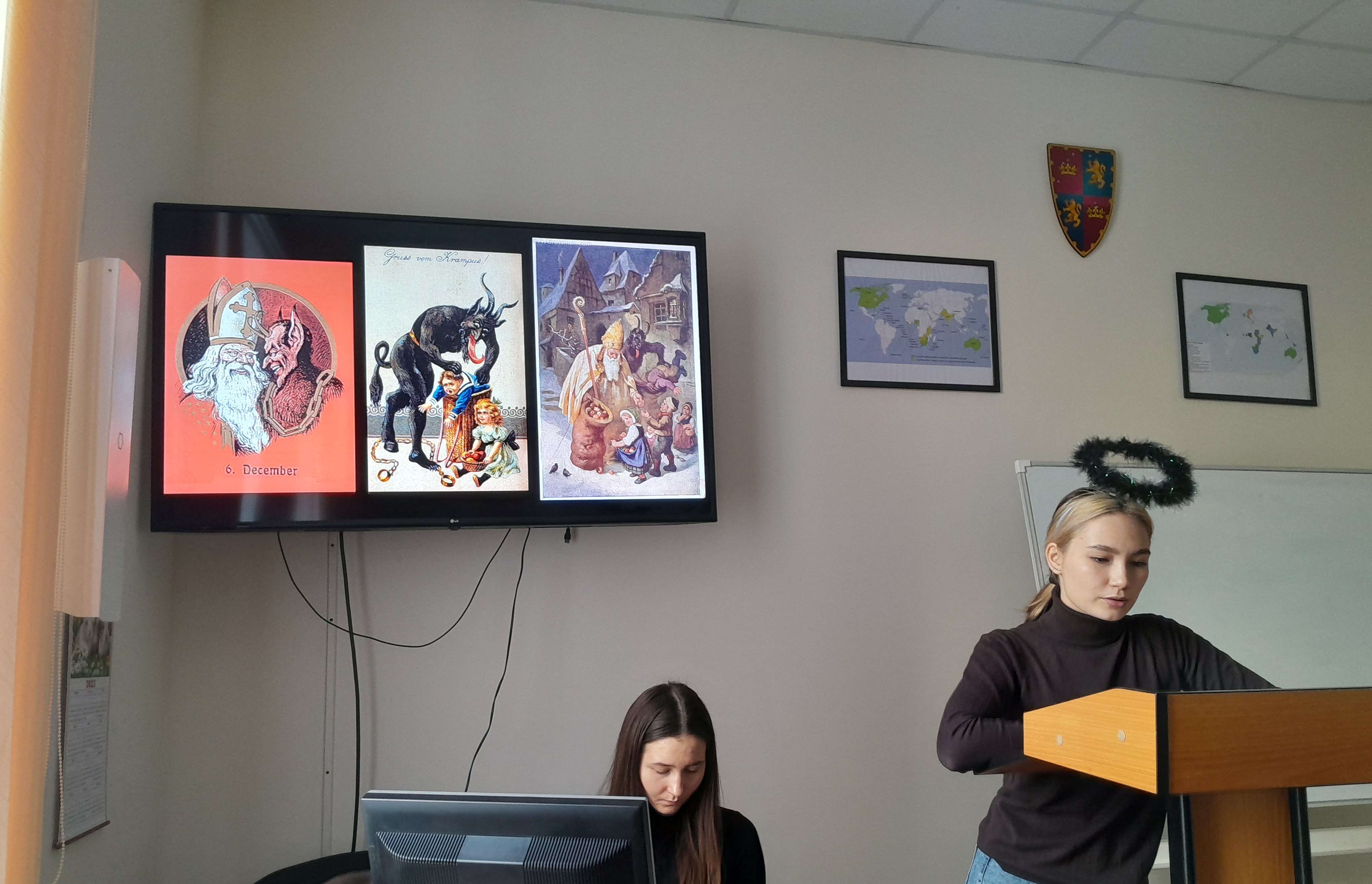 На 15-ой учебной неделе на английском языке преподавателями кафедры было организовано и проведено мероприятие «Санта-Клаус и другие зимние фольклорные персонажи» (“Santa Claus and other winter folkloric characters”). В докладах студентов с позиций междисциплинарного подхода была рассмотрена история появления некоторых зимних персонажей, таких как, например, Санта Клаус, Кнехт Рупрехт и Крампус. В сравнительно-сопоставительном аспекте была также проанализирована специфика образов т.н. рождественских дарителей (“Christmas gift-givers”), которые встречаются в фольклорном наследии разных народов мира. Данное мероприятие, несомненно, расширило знания студентов в рамках предметных областей страноведения и лингвофольклористики и способствовало развитию межкультурной компетенции.