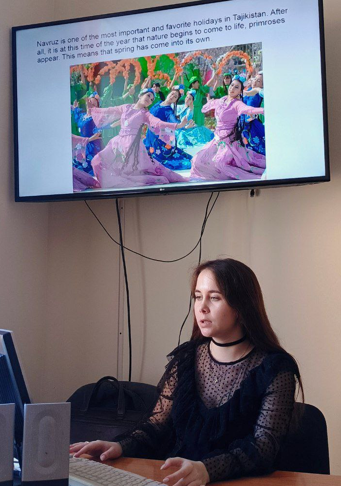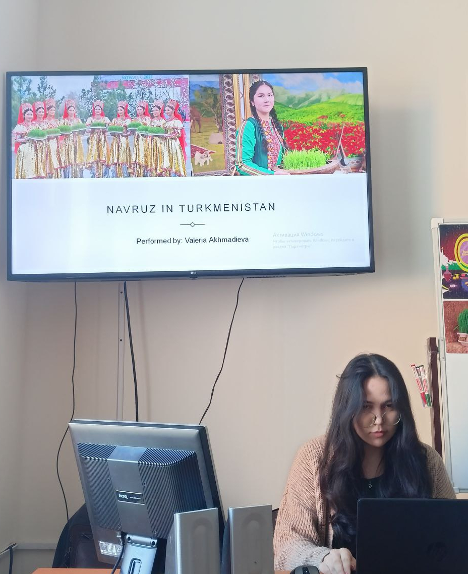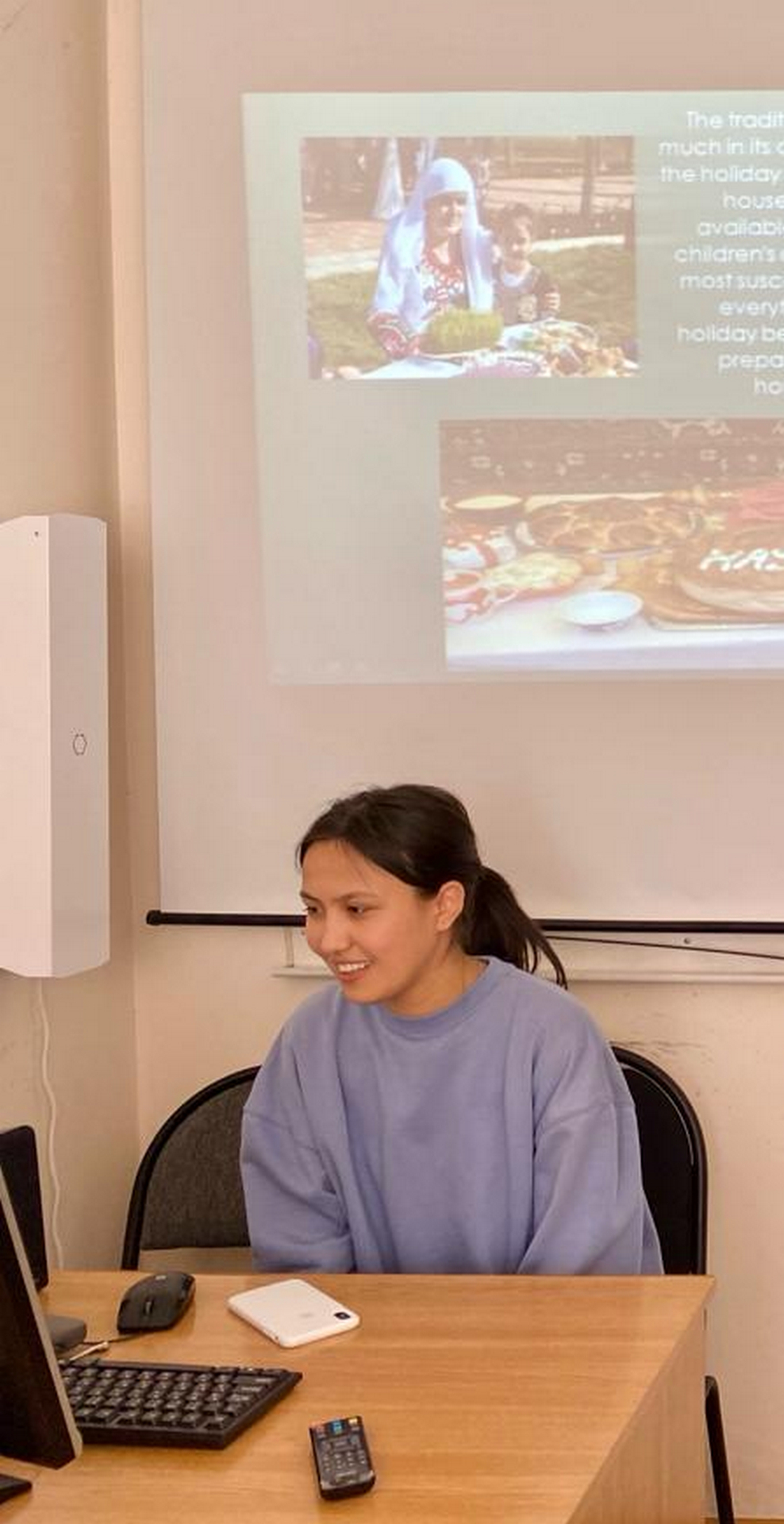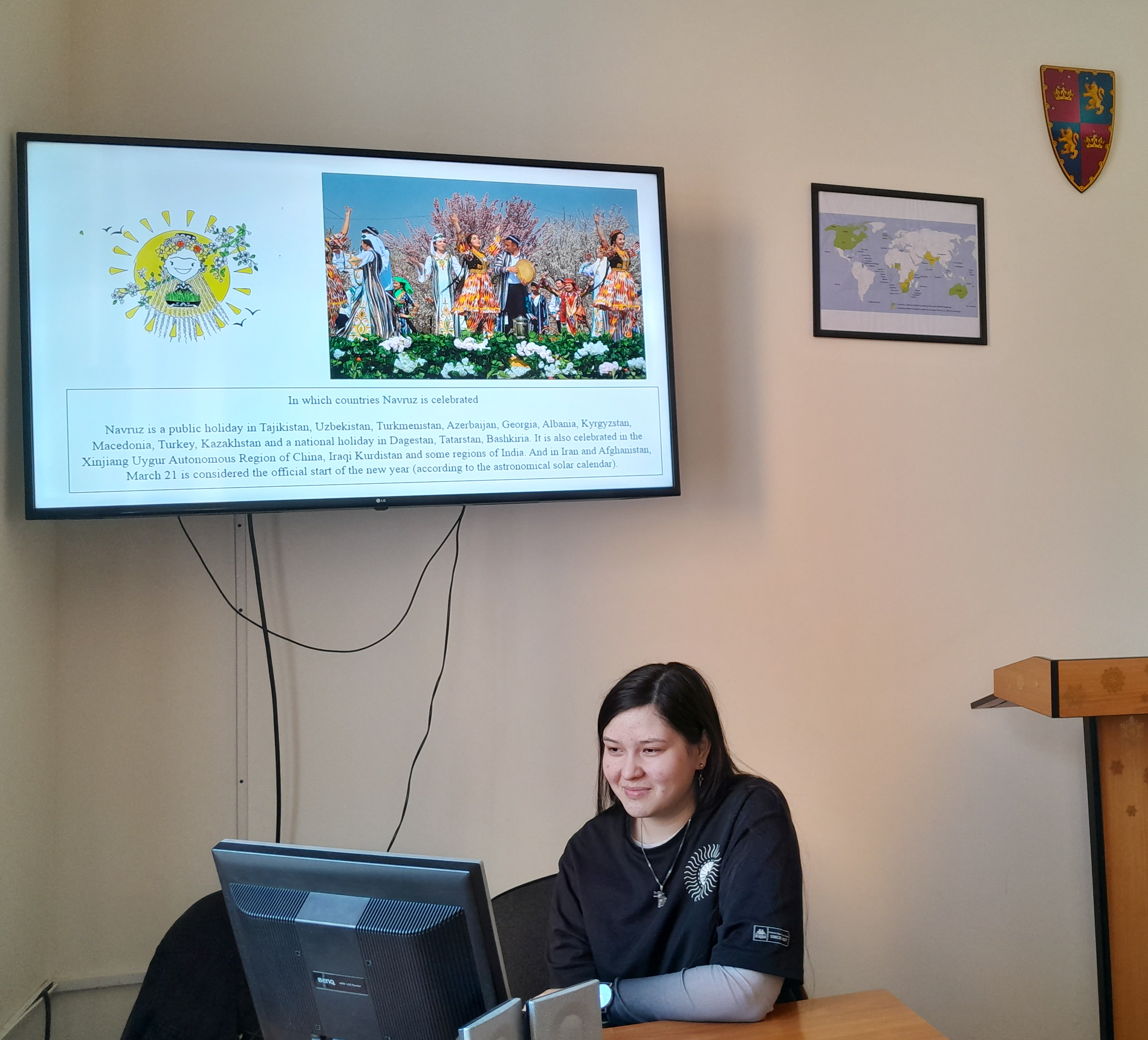 В мероприятии кафедры иностранных языков в дистанционном формате приняли участие и студенты Республики Казахстан. Например, Айым Тактарбекова (рук.: Серик Кульпеисов, Костанайский социально-технический университет им. академика З. Алдамжар) подготовила информативную и красочную презентацию, раскрывающую особенности празднования Навруза в Средней Азии.