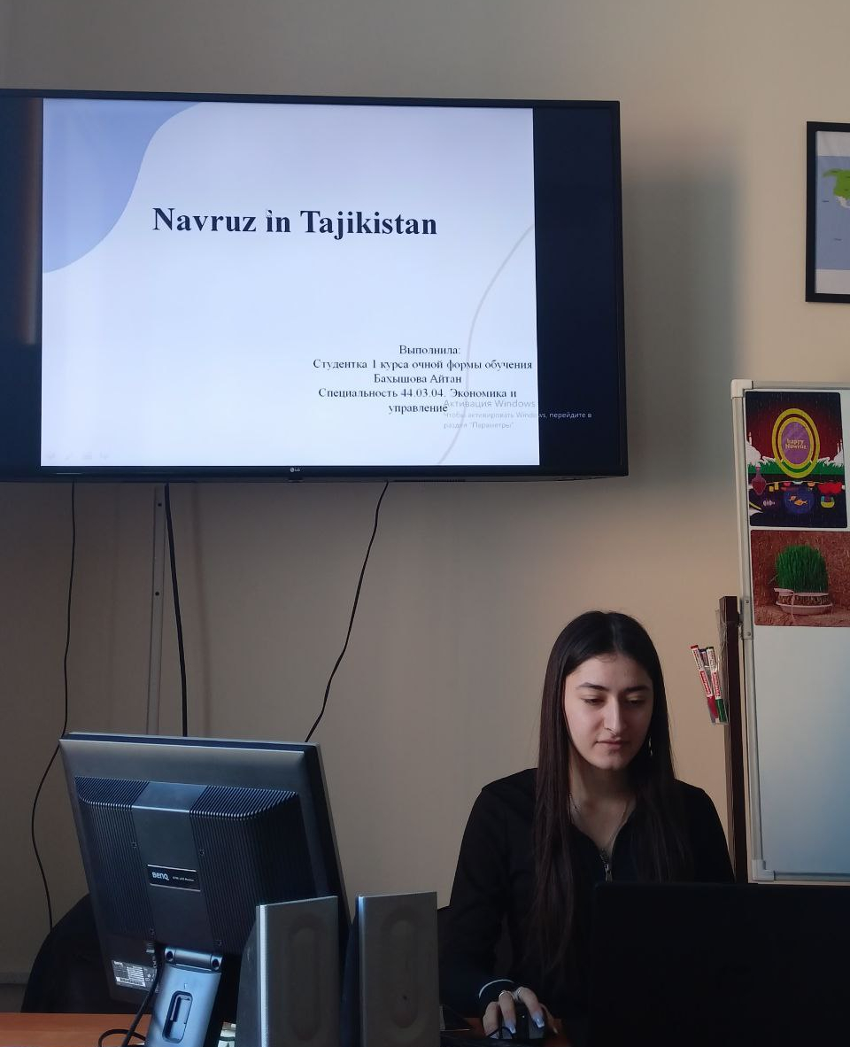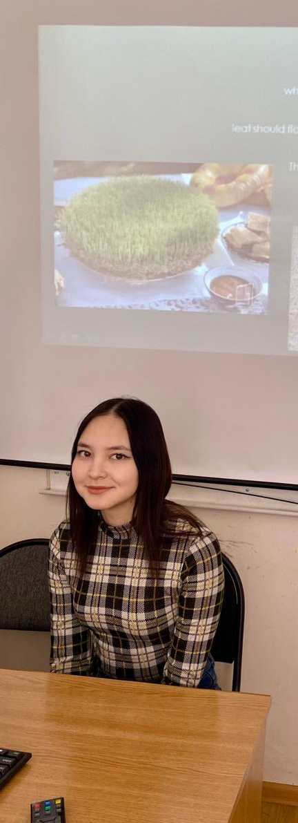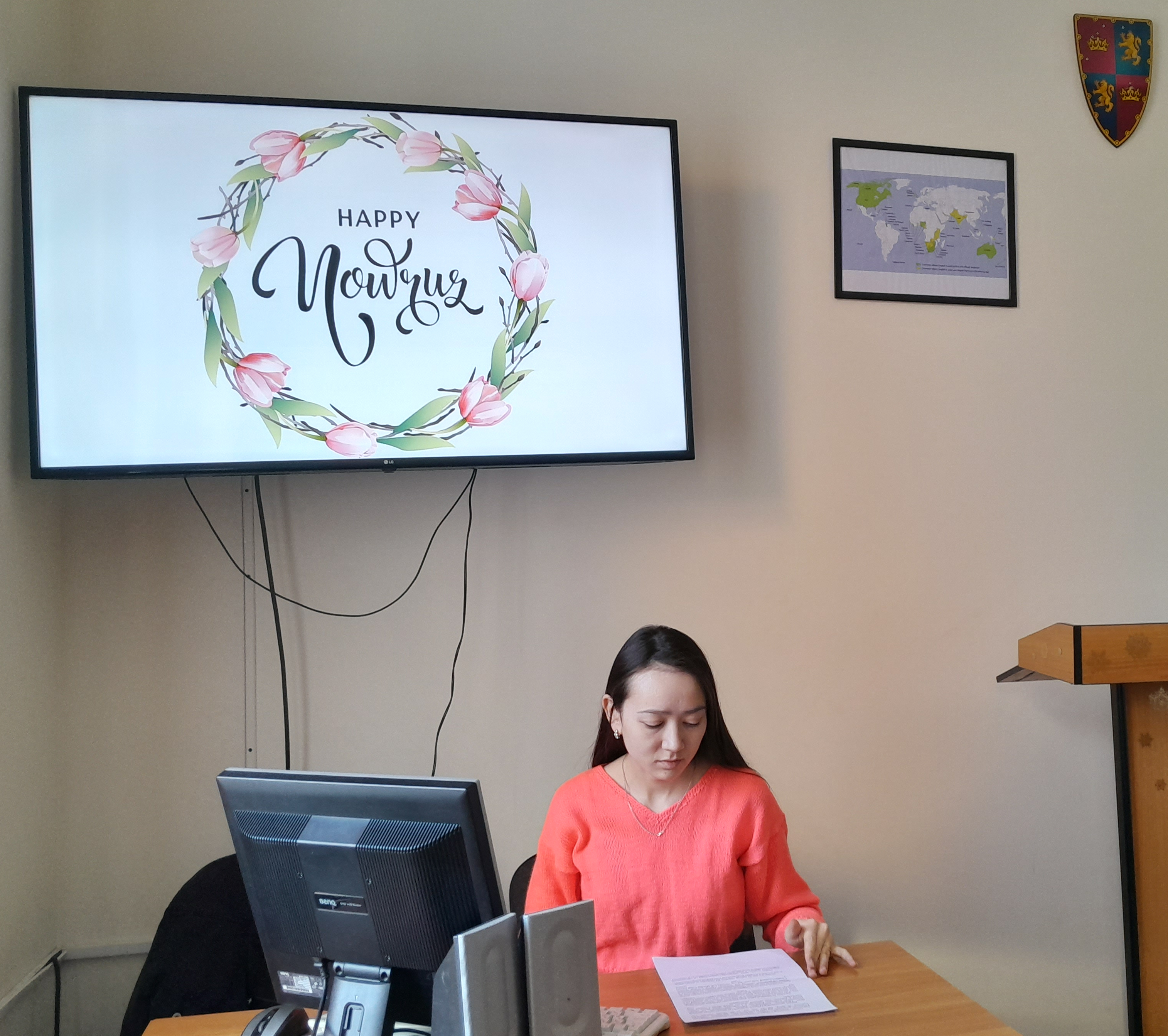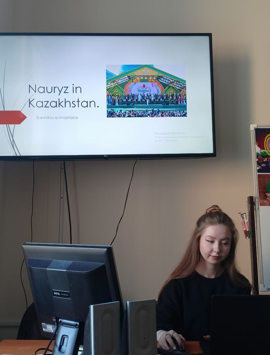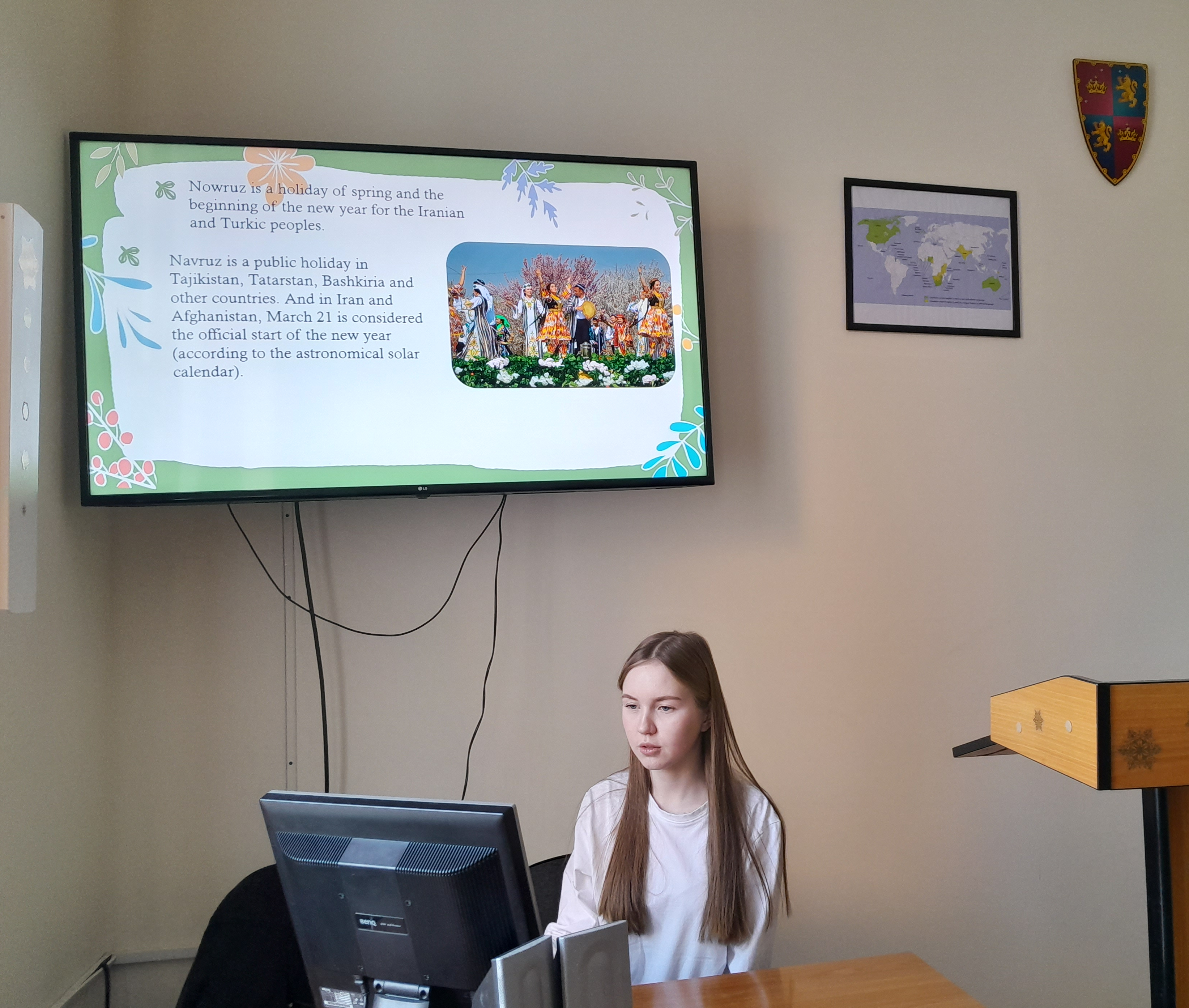 В мероприятии кафедры иностранных языков в дистанционном формате приняли участие и студенты Республики Казахстан. Например, Айым Тактарбекова (рук.: Серик Кульпеисов, Костанайский социально-технический университет им. академика З. Алдамжар) подготовила информативную и красочную презентацию, раскрывающую особенности празднования Навруза в Средней Азии.