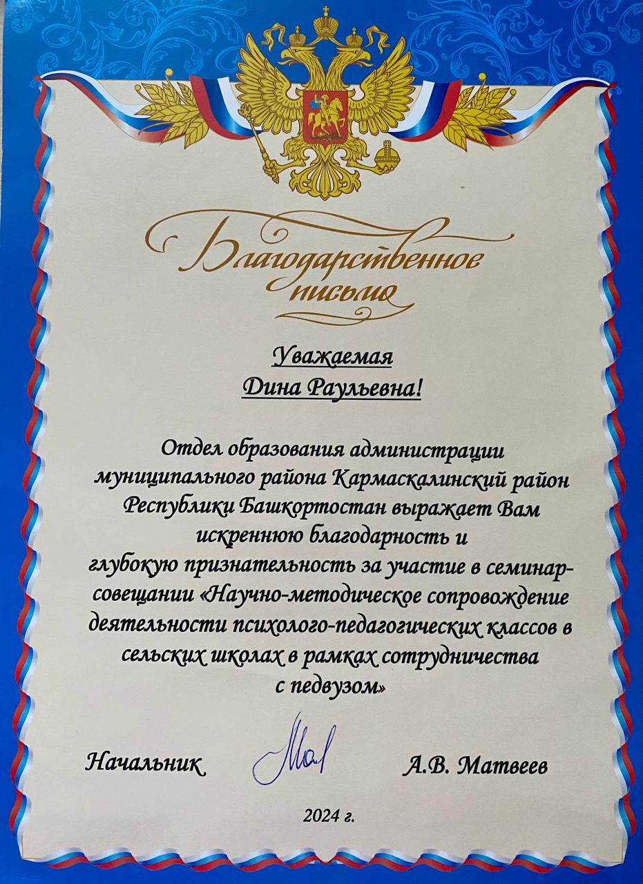 20 августа 2024 года доцент кафедры иностранных языков Дина Раульевна Фатхулова приняла участие в августовском семинаре-совещании директоров школ Кармаскалинского района "Научно-методическое сопровождение деятельности психолого-педагогических классов в сельских школах в рамках сотрудничества с педвузом", который  собрал всех заинтересованных в рамках данного направления, активно развивающегося в Кармаскалинском районе.