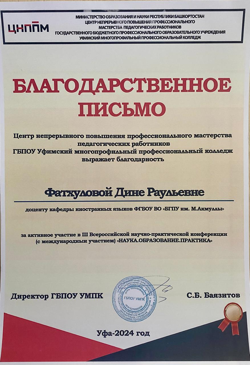14 ноября 2024 года на базе Центра непрерывного повышения профессионального мастерства педагогических работников ГБПОУ Уфимского многопрофильного профессионального колледжа прошла III Всероссийская научно-практическая конференция (с международным участием) «Наука. Образование. Практика».