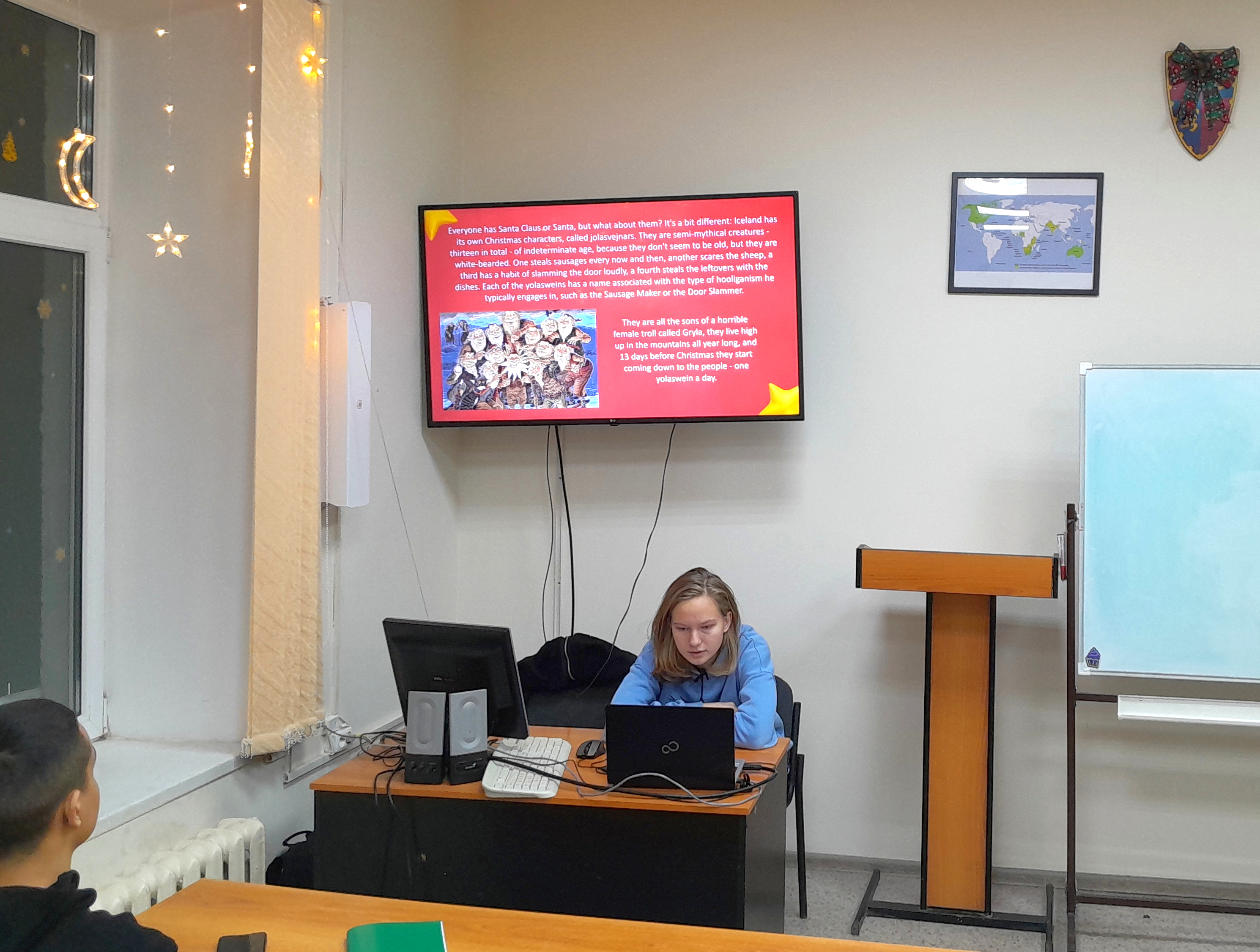 На 17-ой учебной неделе преподавателями кафедры иностранных языков (Д. Р. Фатхулова, А. И. Шагапов) было организовано и проведено мероприятие «Английское Рождество, Нардуган, Шорыкйол и другие зимние праздники народов мира: традиции, обычаи, мифологические персонажи». В докладах студентов на английском языке с позиций междисциплинарного подхода были проанализированы особенности традиционных зимних праздников в современном мире (страны Европы, Китай, Корея, Япония, Таиланд, Турция, Нигерия, Бразилия и др.). Была также рассмотрена история появления некоторых зимних персонажей, таких как, например, Йоулупукки (фин. Joulupukki «Дед на козле»). В сравнительно-сопоставительном аспекте была проанализирована специфика образов рождественских дарителей (“Christmas gift-givers”), которые встречаются в фольклорном наследии разных народов мира. Отдельное внимание было уделено выступлениям на английском языке, посвященным зимним праздникам народов Российской Федерации, таким как, например, тюркский Нардуган, марийский Шорыкйол и чувашский Сурхури. Мероприятие, несомненно, способствовало расширению знаний студентов в рамках предметных областей страноведения и лингвокультурологии и содействовало развитию языковой и межкультурной компетенций.