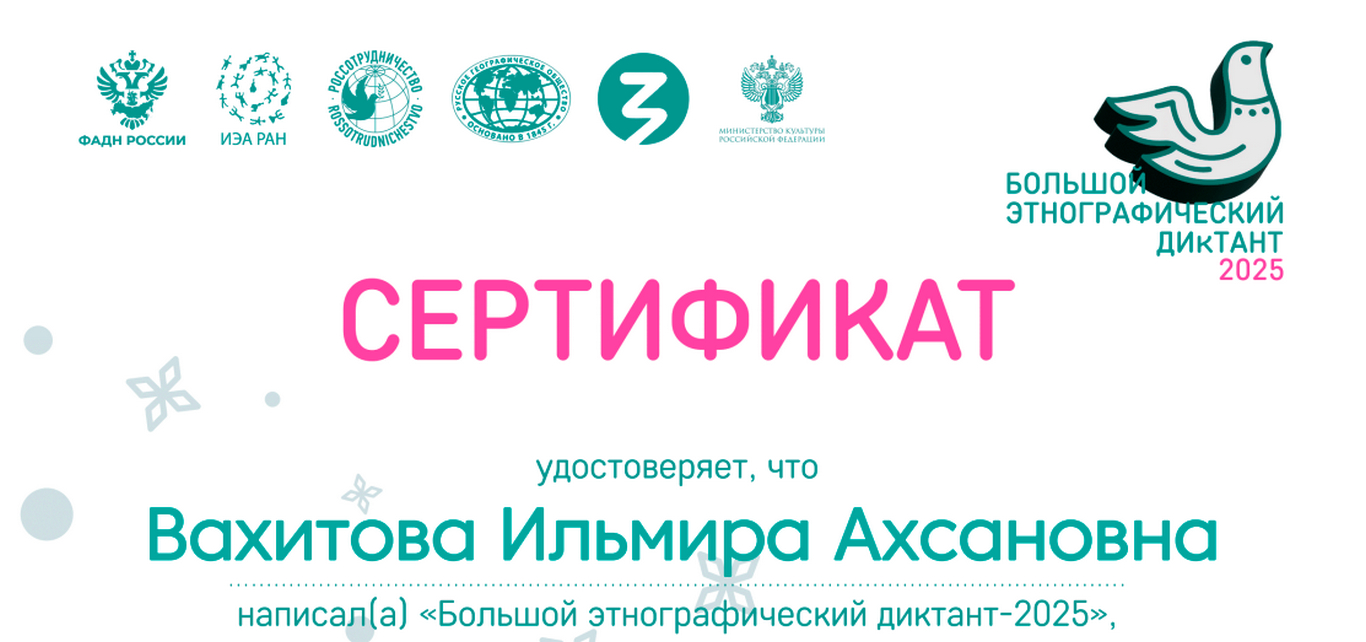 С 1 по 8 ноября 2025 года преподаватели кафедры иностранных языков И. А. Вахитова, О. Е. Кулешова, Р. И. Сафарова, Д. Р. Фатхулова, С. М. Хантимиров, А. И. Шагапов, В. Д. Швайко приняли участие в Юбилейной X Всероссийской просветительской акции «Большой этнографический диктант».