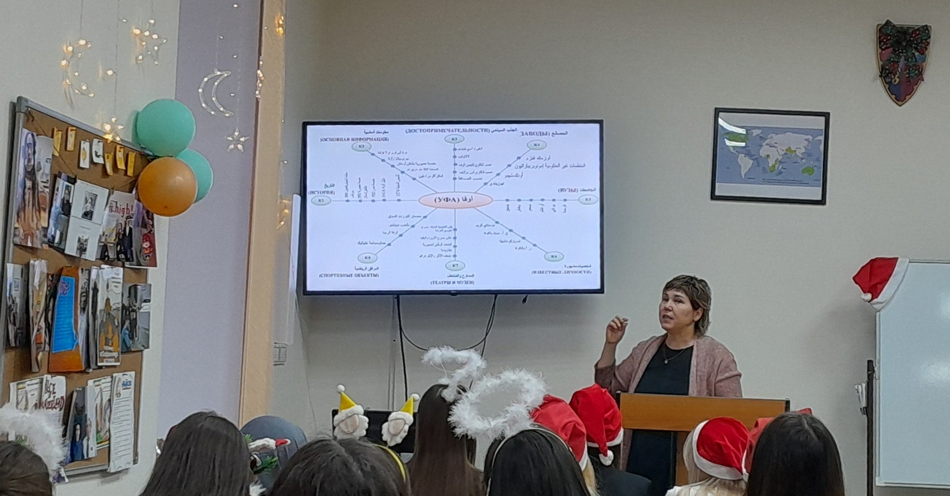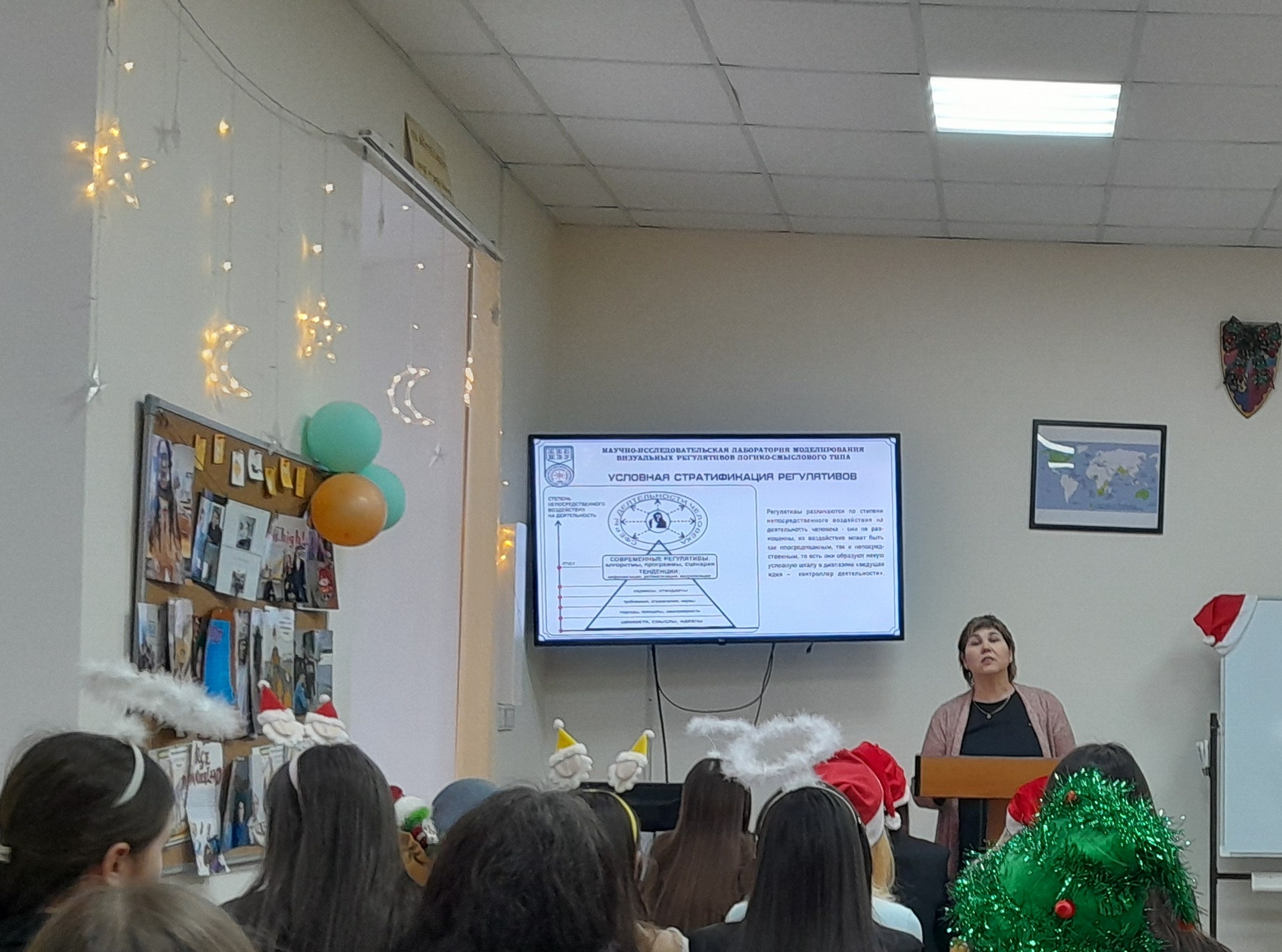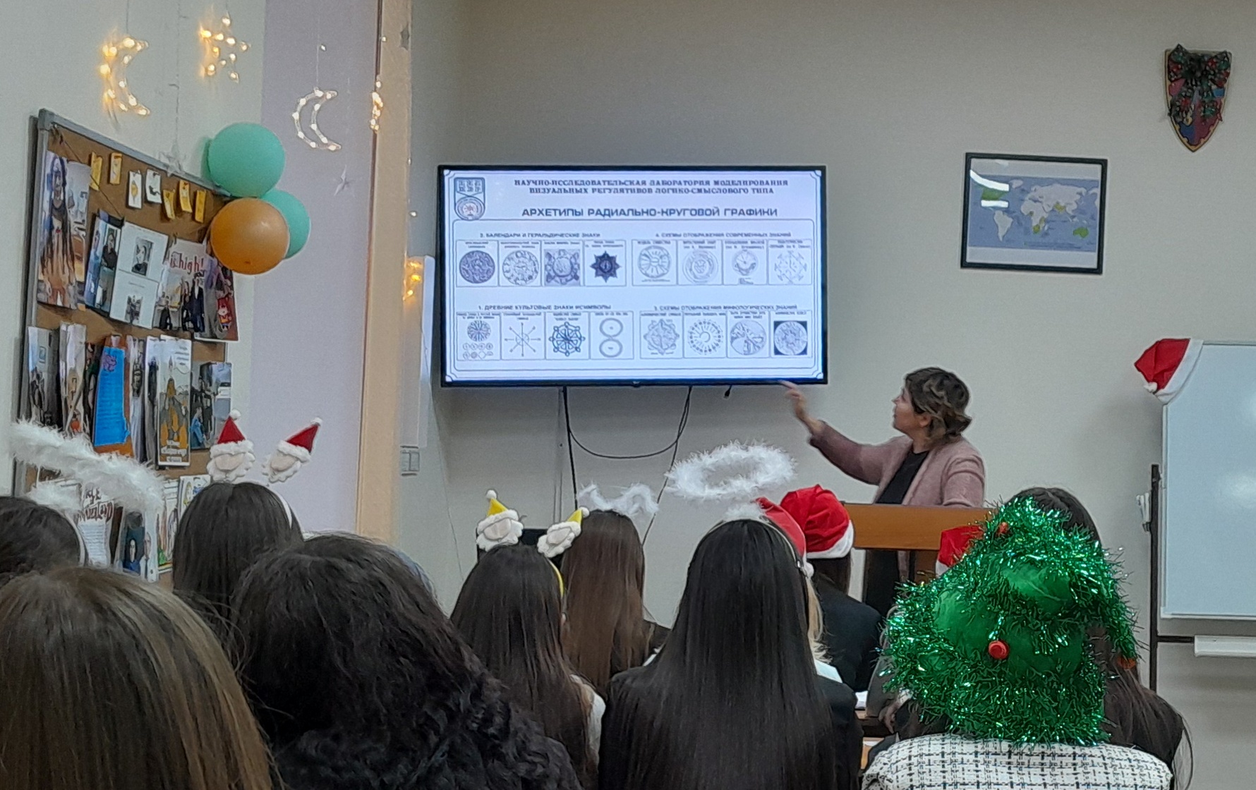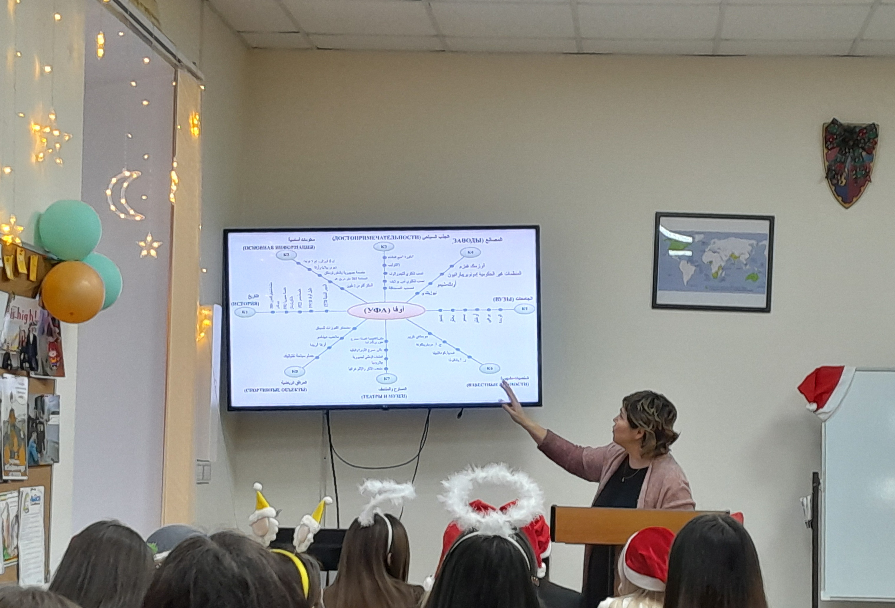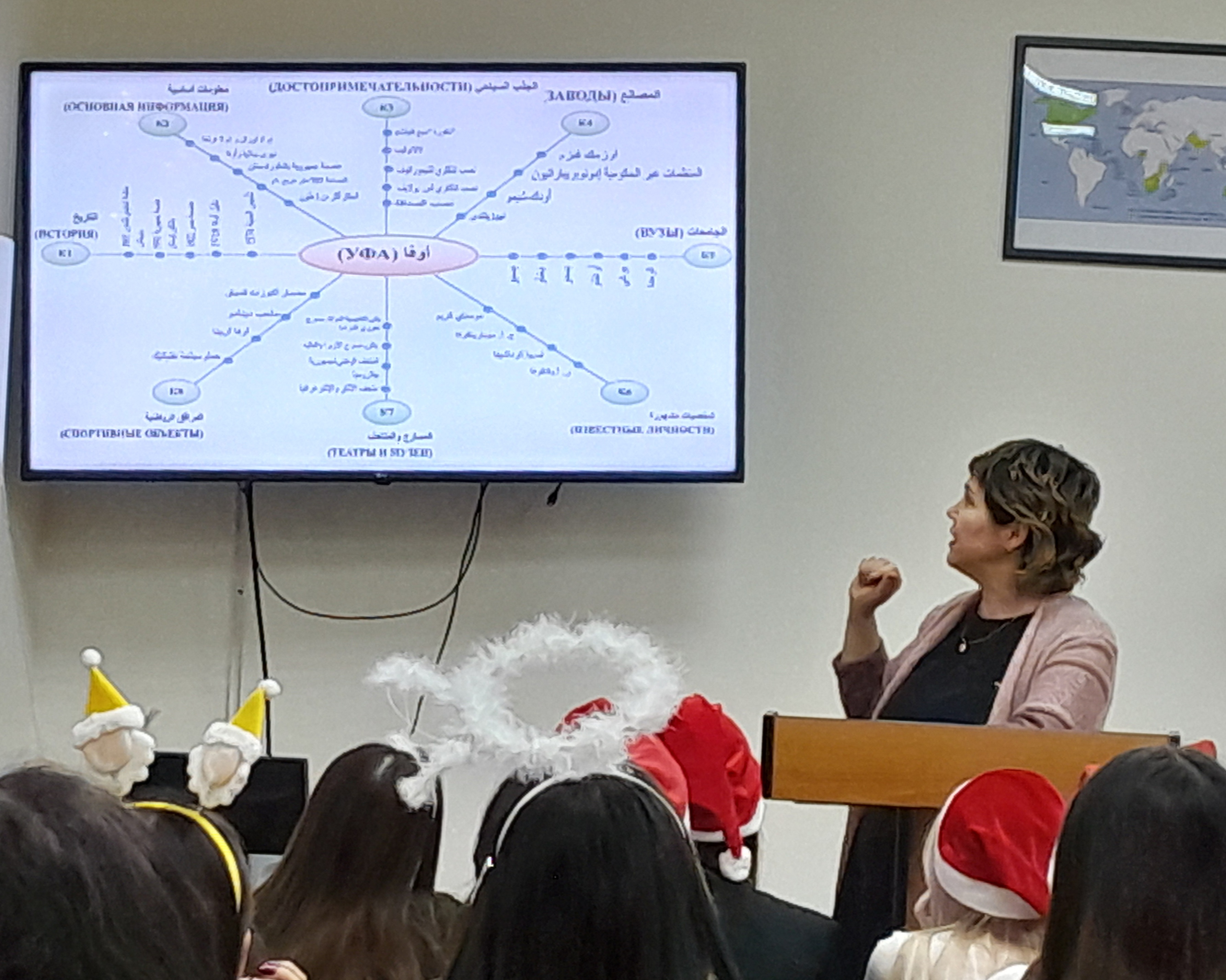 В самом начале встречи было рассказано о научно-исследовательской лаборатории моделирования визуальных регулятивов логико-смыслового типа, которая входит в состав научно-исследовательского института стратегии развития образования (БГПУ им. М. Акмуллы). Далее Дина Раульевна ознакомила всех присутствующих с условной стратификацией регулятивов и архетипами радиально-круговой графики, а также объяснила концепцию визуального дидактического регулятива «Волшебная шпаргалка» на примере разных языков (английский, французский, башкирский, китайский, арабский). В конце мероприятия студентам был представлен визуальный регулятив «Новый год».