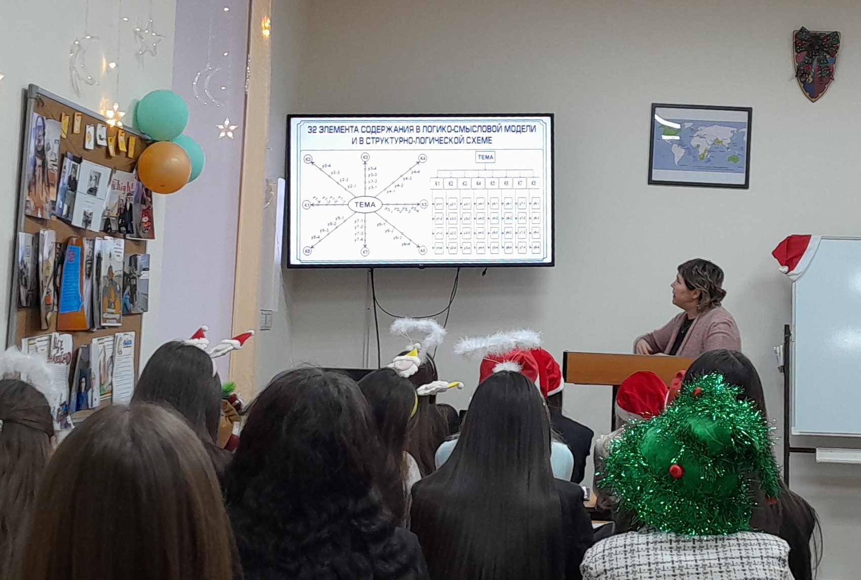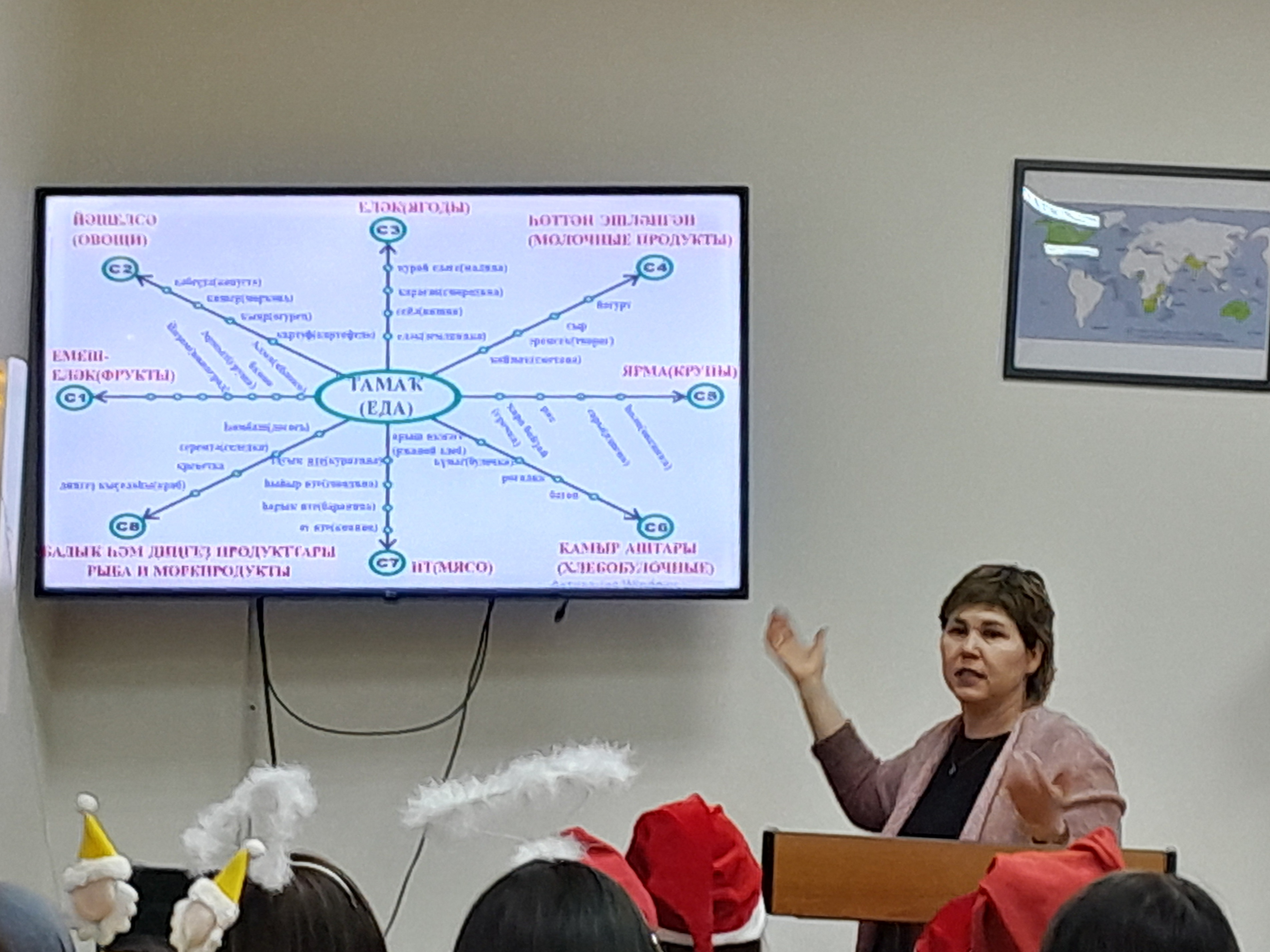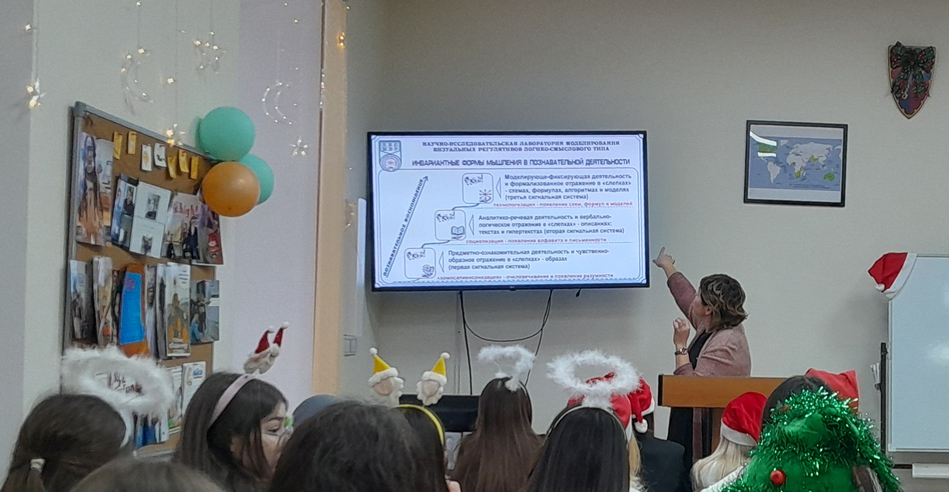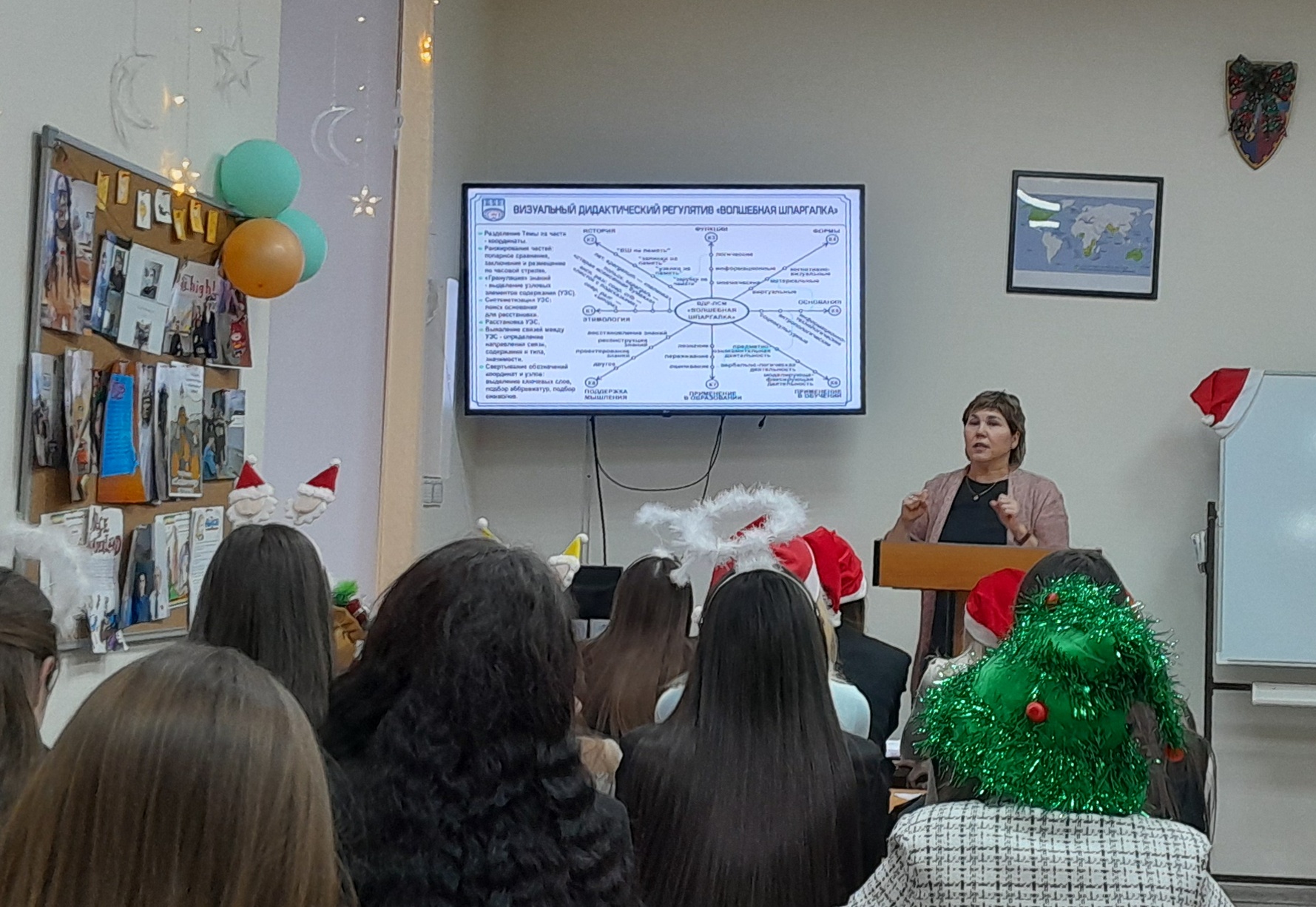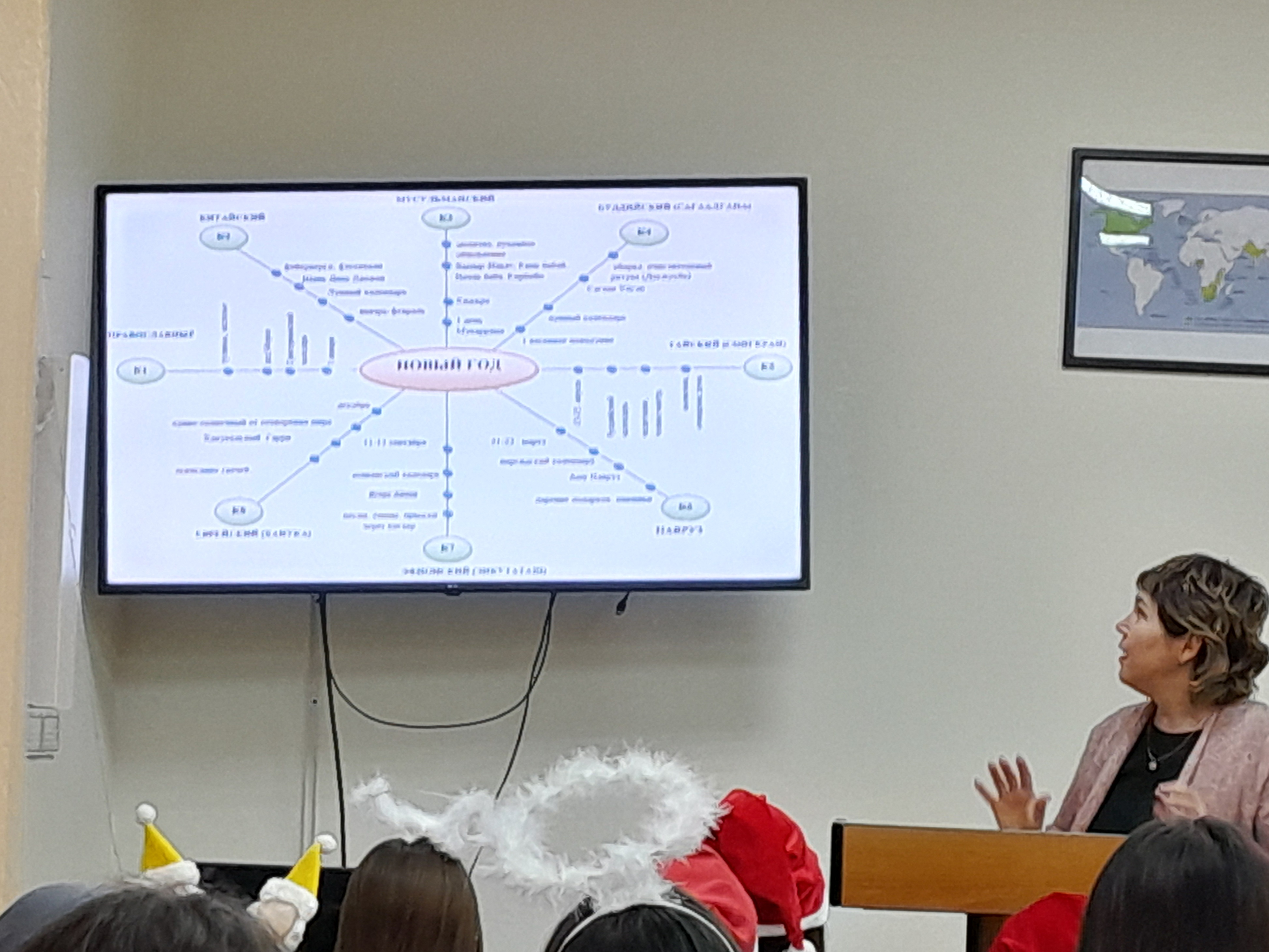 В самом начале встречи было рассказано о научно-исследовательской лаборатории моделирования визуальных регулятивов логико-смыслового типа, которая входит в состав научно-исследовательского института стратегии развития образования (БГПУ им. М. Акмуллы). Далее Дина Раульевна ознакомила всех присутствующих с условной стратификацией регулятивов и архетипами радиально-круговой графики, а также объяснила концепцию визуального дидактического регулятива «Волшебная шпаргалка» на примере разных языков (английский, французский, башкирский, китайский, арабский). В конце мероприятия студентам был представлен визуальный регулятив «Новый год».